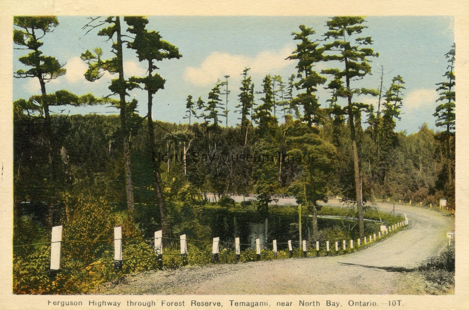 This is a coloured, 9 cm x 13.5 cm approx postcard. The picture is of a plate of Ferguson highway through forest reserve. In the image the highway is surrounded by a variety of types of trees and vegetation. There is a white fence seperating the forest from the highway. The highway is a curving unpaved road. This image was taken in Temagami, ON.