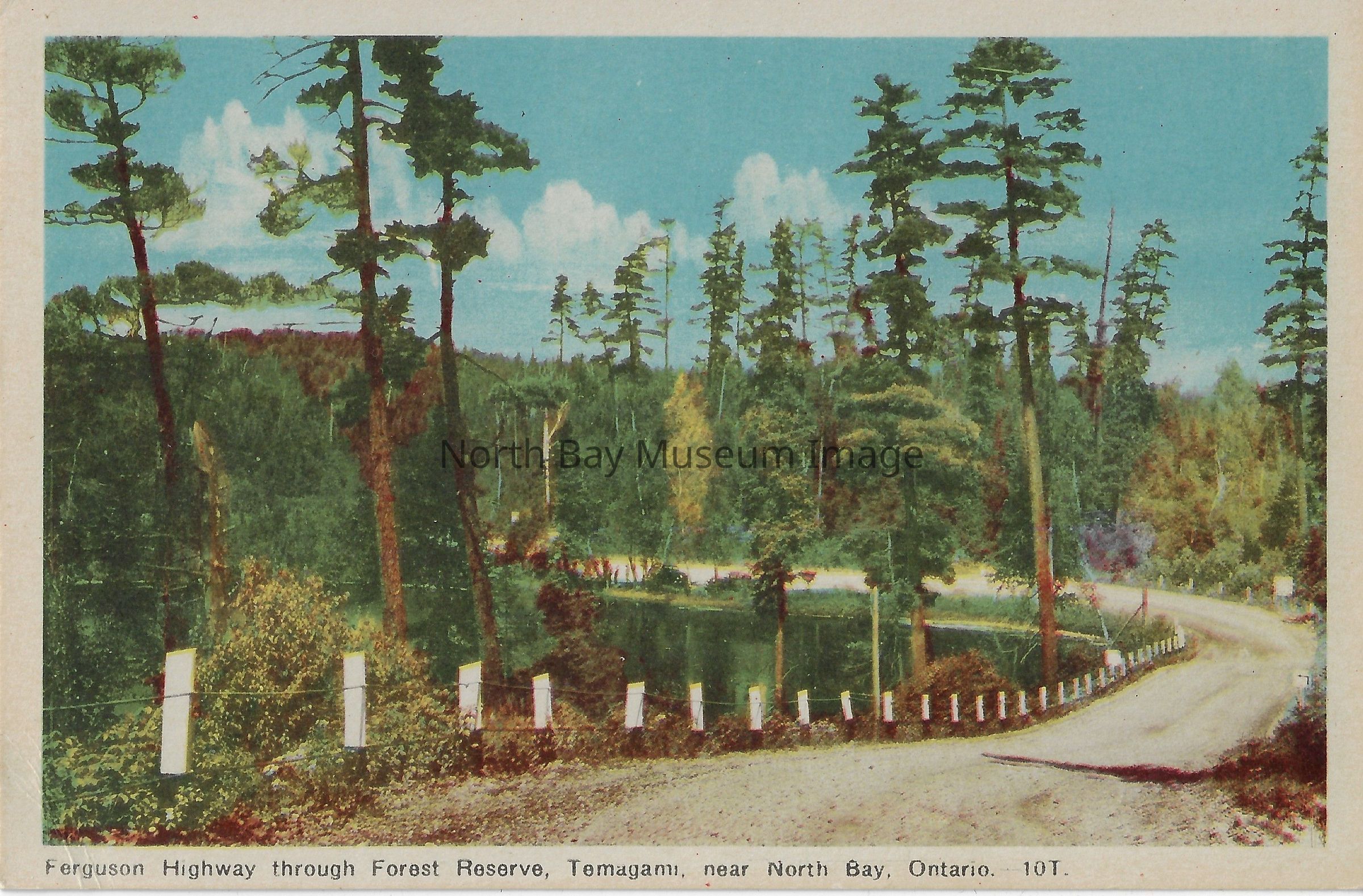 Colour, painted postcard. The postcard shows a empty, dirt road. On both sides of the road is a wooded area, covered in trees and vegetation. The postcard is entitled "Ferguson Highway through Forest Reserve, Temagami, near North Bay, Ontario. - 10T."Date(s) of Creation