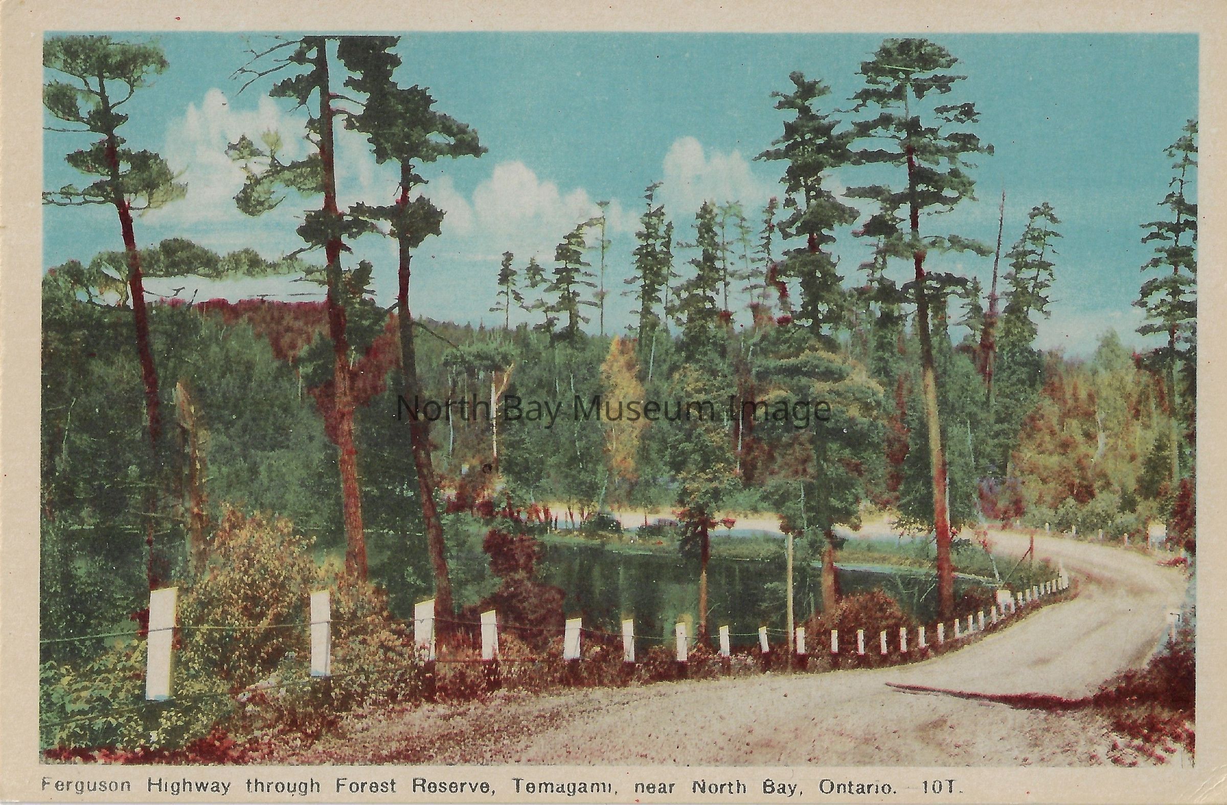 This is a colour, painted postcard. The highway is a dirt highway that is very winding. The highway is the middle of the bush. The caption of the postcard is "Ferguson Highway through Forest Reserve, Temagami, near North Bay, Ontario. - 10T." Inscription on back: "Now No. 11 Hwy.".Date(s) of Creation