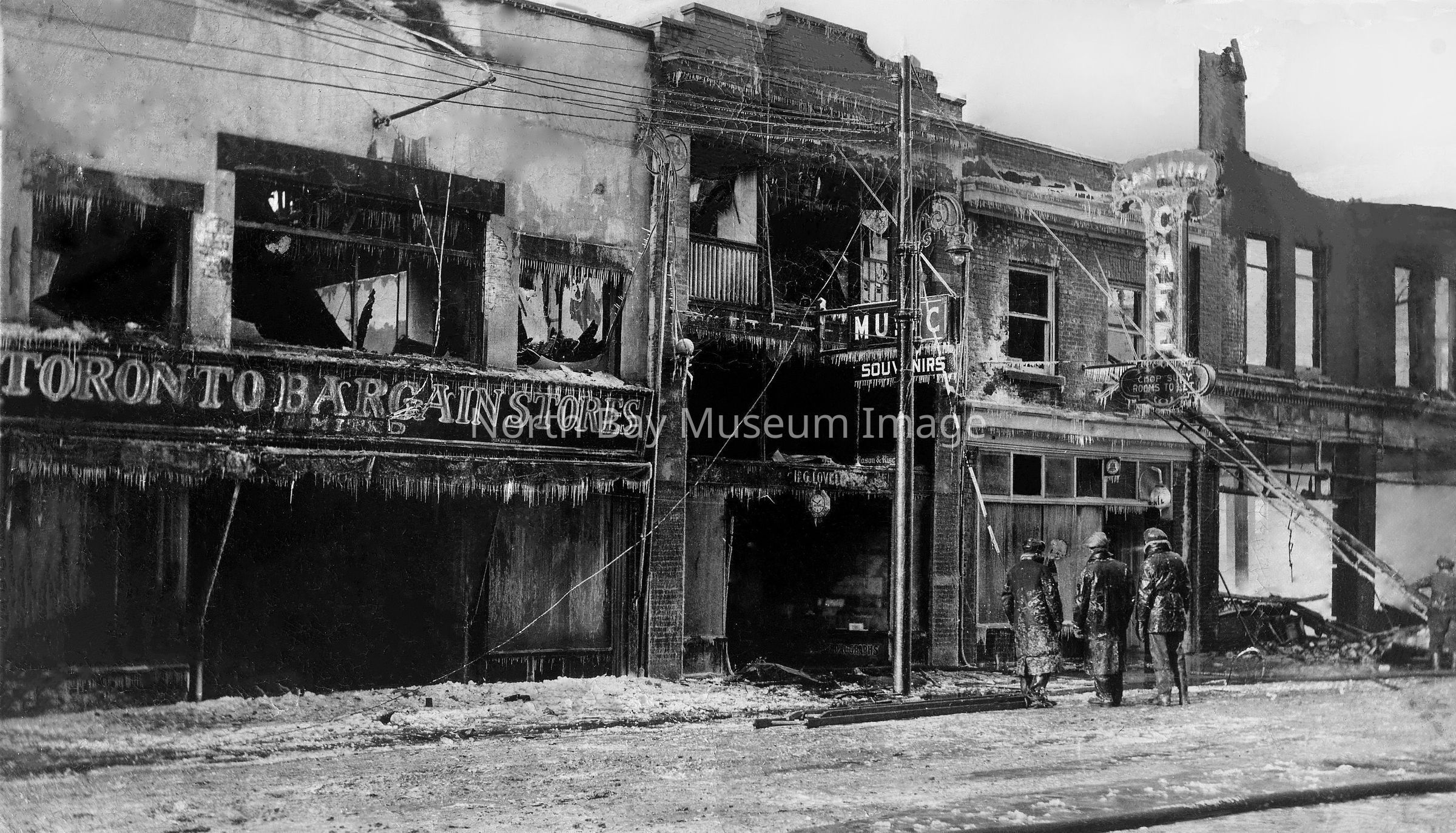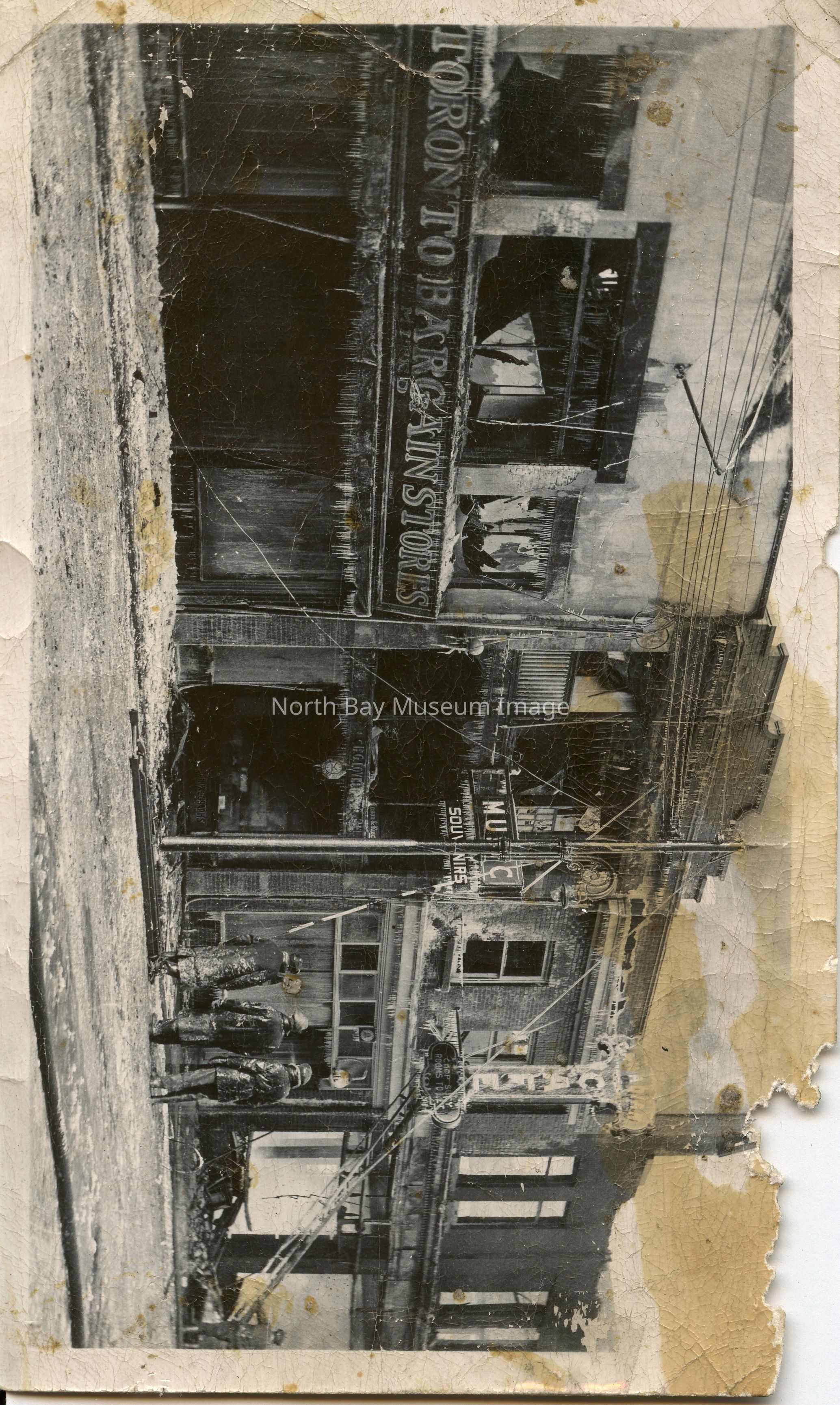 Photo shows Lovell's music store after a fire with firefighters standing in front of the store. Toronto Bargain stores on the left and Canadian Cafeon the right. The back of the photo is dated to 1937. H. Gordon Lovell, opened Lovells Music Store on 47 Main Street East in 1920. The business quickly grew and moved into a larger location at 185 Main Street West in 1927. The store carried sheet music, records, pianos, gramophones, and other musical instruments. The damage from the fire was later repaired and the store remained in that location until moving into a smaller location at 188 Oak Street in 1965.