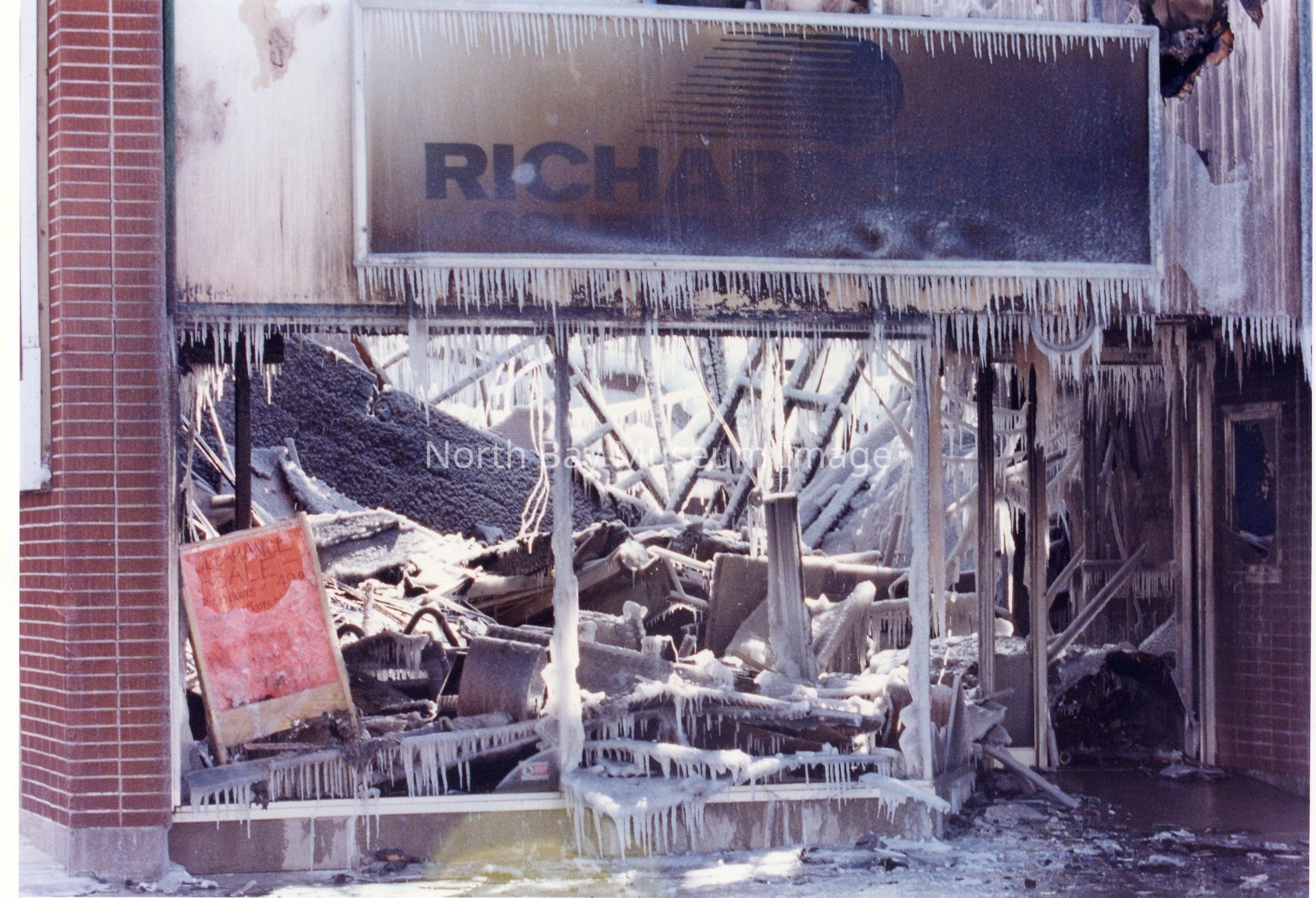 -Frozen aftermath of fire on Fraser St. -Concrete and timbers caved into main floor, from upper floors. -Sign in store front window frame reads "clearance sale". -Burnt sign of Richardson store above window with logo on it.