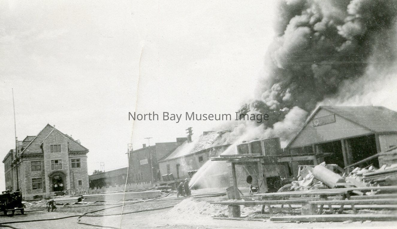 Black and white photo of Can. Oil across from ONR (before Fayarbanks) on fire. ONR office building in sight on right side of photo. ]