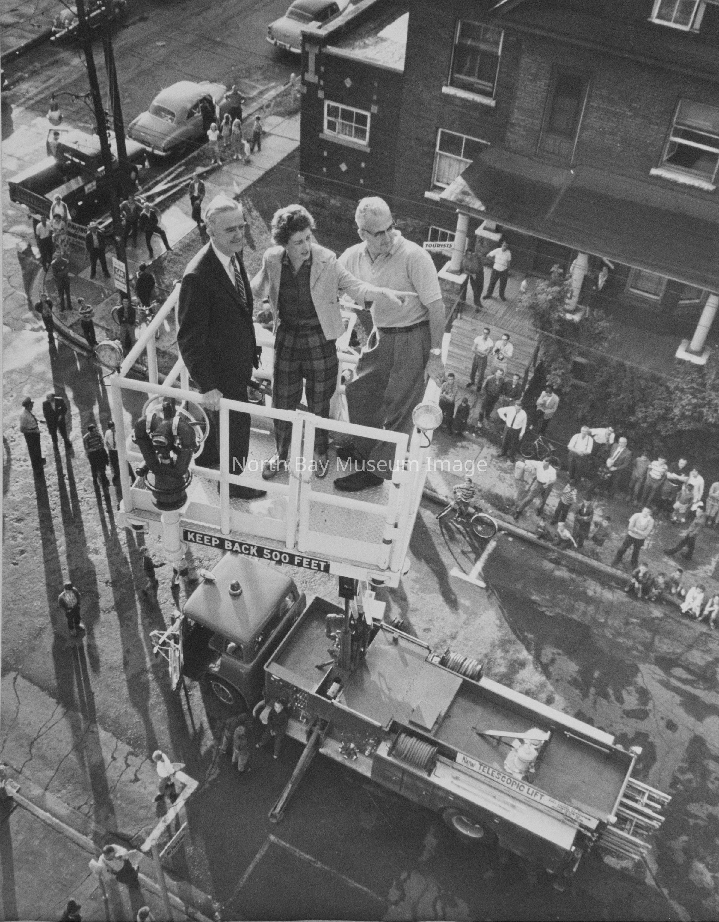 Print is a black and white photograph of Mayor Cecil Hewitt, Alderman Orma McNaughton, and a firefighter on a new platform overlooking the corner of Fraser and McIntyre. The platform was purchased because the previous was three stories tall and a new building was being made that was five stories. The photograph was taken from inside the Empire Hotel.