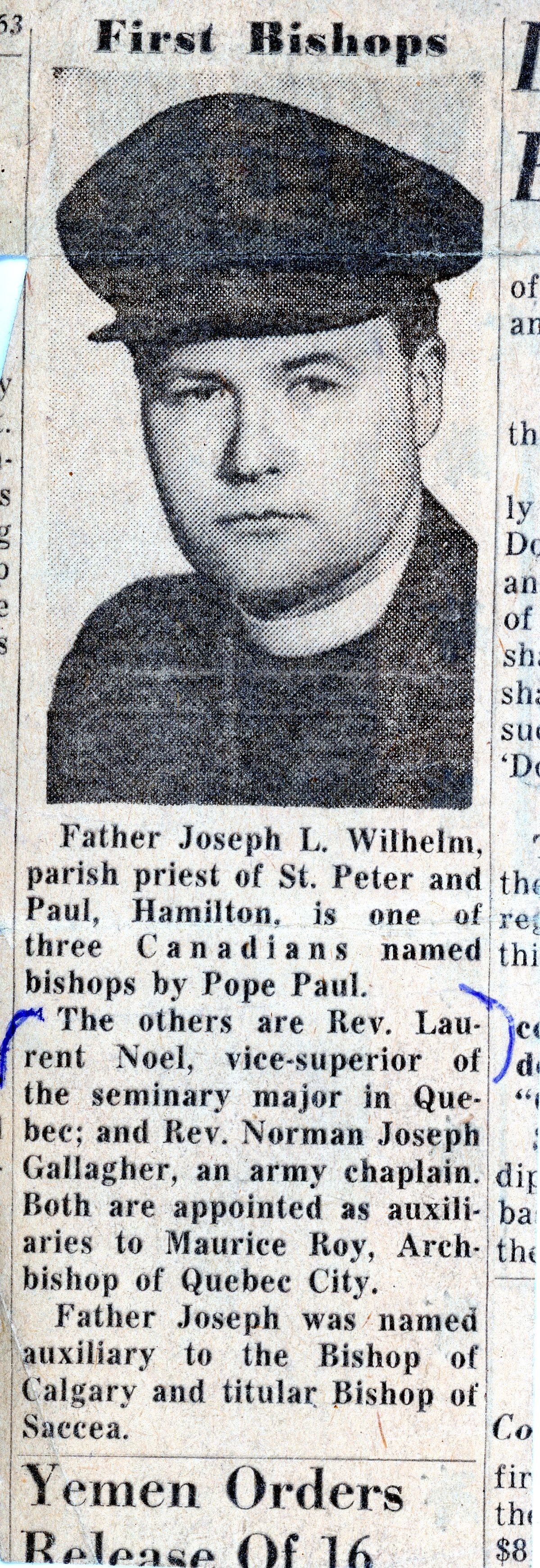 Article detailing the naming of bishops by Pope Paul including Father Joseph L. Wilhelm, Rev. Laurent Noel, Vice-Superior of the seminary major in Quebec, and Rev. Norm Jospeh.