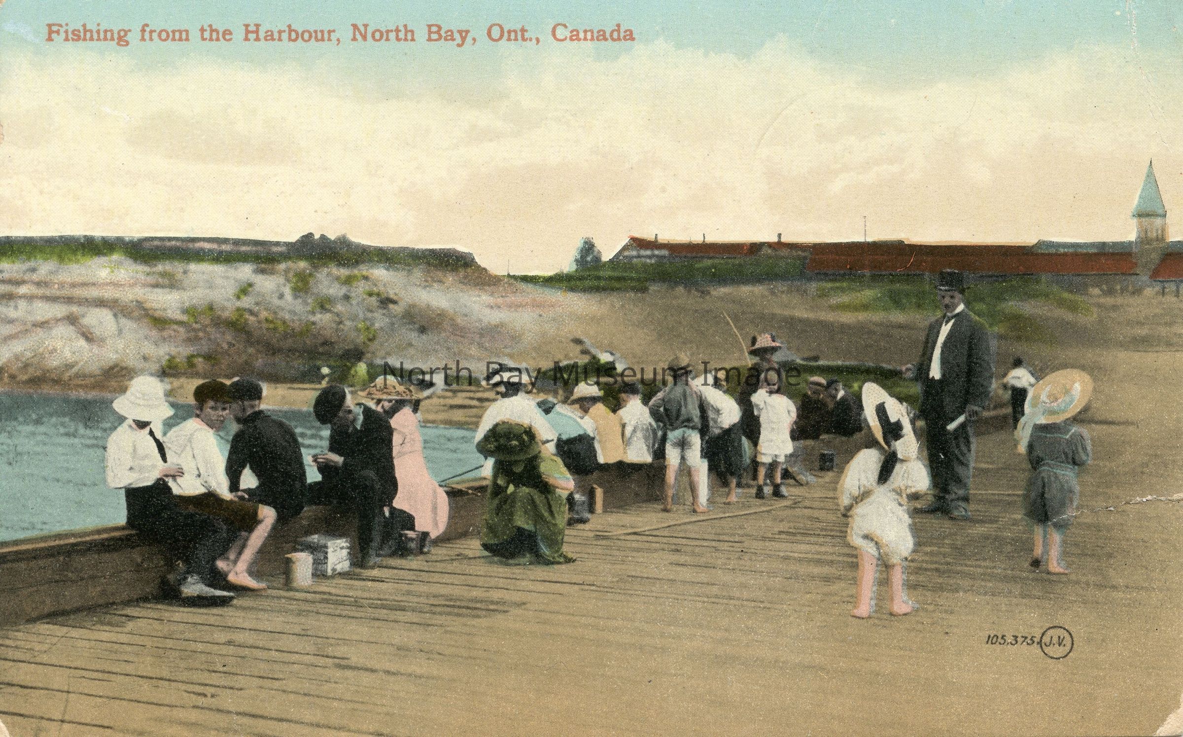 Postcard with hand-colored photo of more than a dozen people sitting on the wooden-plank dock, most with fishing poles in the water and backs to the camera. Several children and a man dressed in 3-piece suit and bowler hat with a rolled-up paper in his left hand are standing on the dock, not involved in the fishing. There's a church spire in the background on the right edge of card.