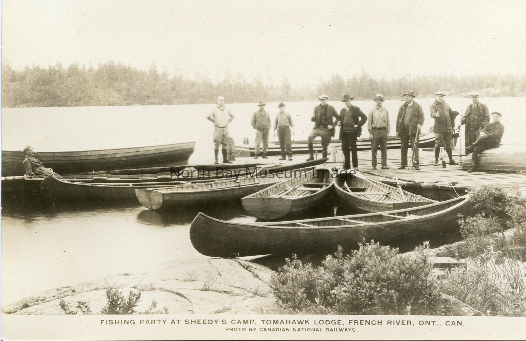 Caption under photo reads: Fishing Party at Sheedy's Camp, Tomahawk Lodge, French River, Ont., Can. Photo by Canadian National Railways