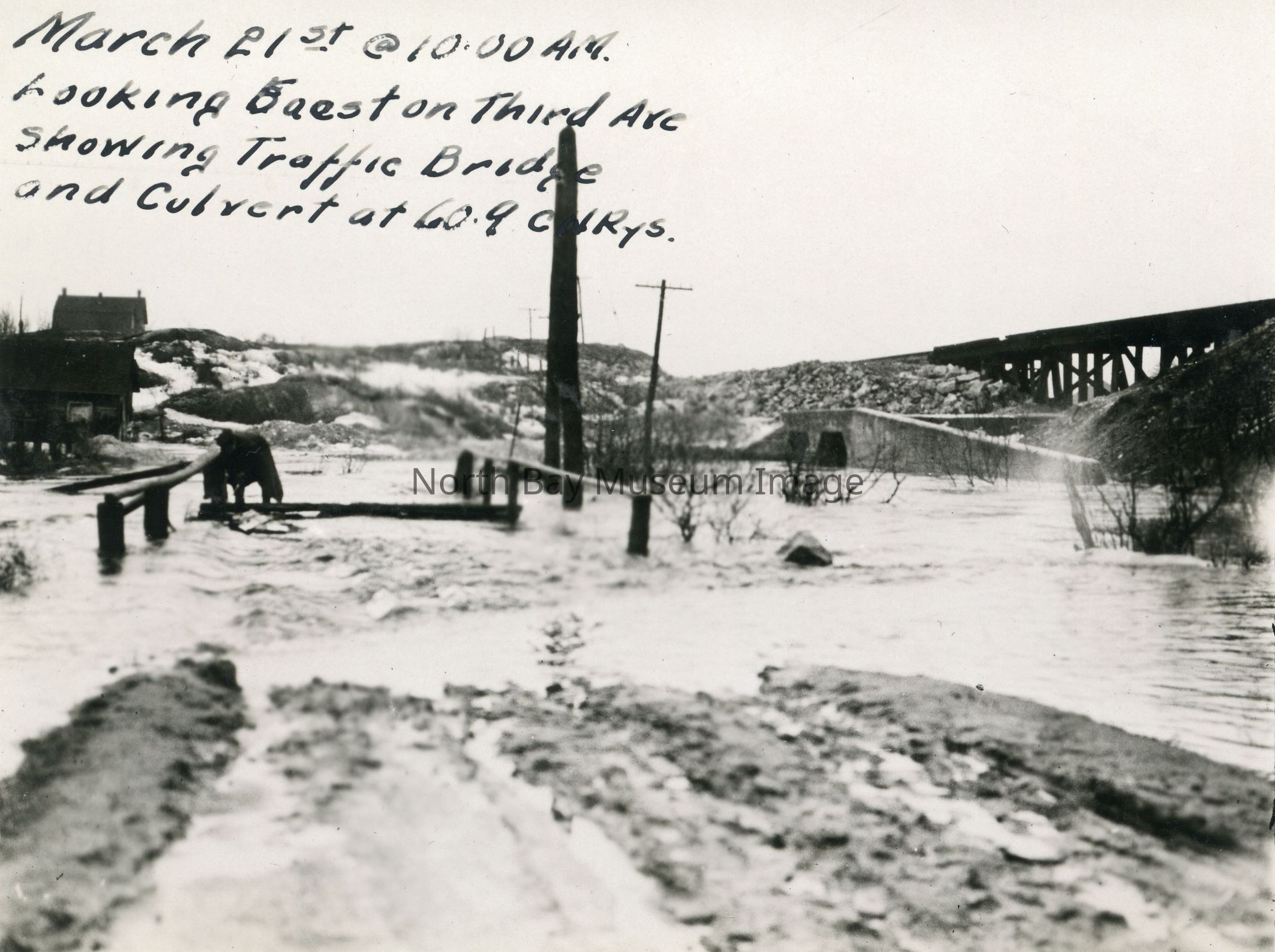 'March 21st @ 10.00 AM Loking East on Third Ave Showing Traffic Bridge and Culver at 60.9 CNRys.' written in black ink in upper lefthand corner.