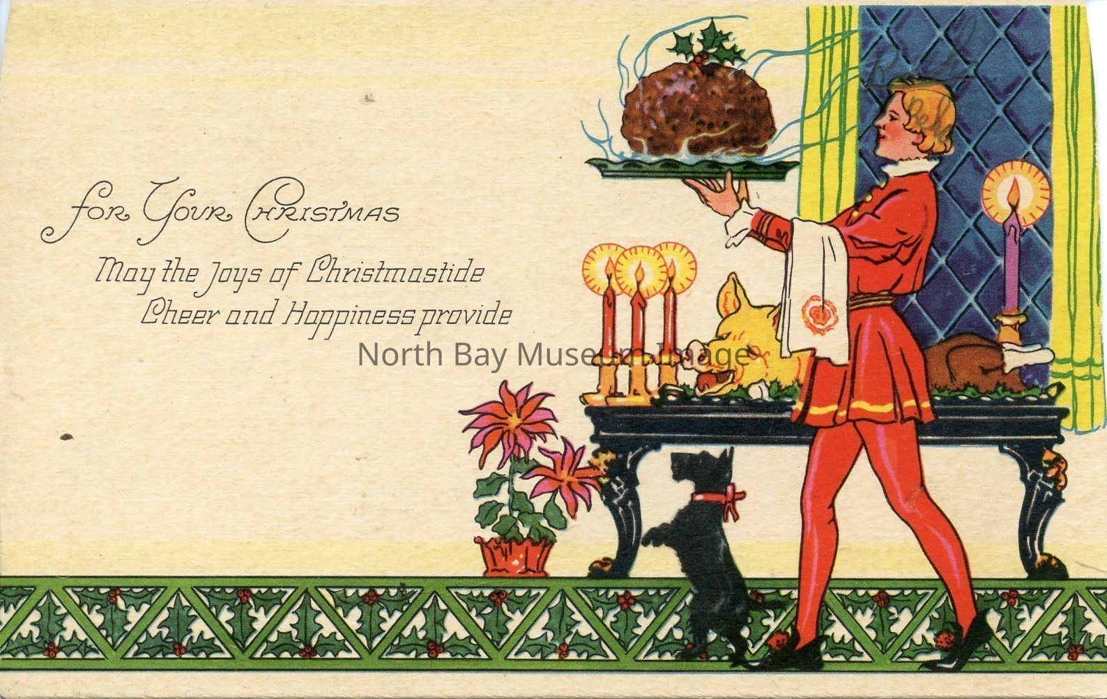 This is a beige Christmas card. On the right hand side is an image of a man dressed up fancy in a red outfit. He is holding a roast turkey on a serving tray. Behind his is a table of Christmas food such as turkey, and a pig. At the bottom of the table is a little dog and a red poinsetta. The left hand side of the postcard has a small poem that reads "for your Christmas may the joys of Christmastide cheer and Christmas provide."