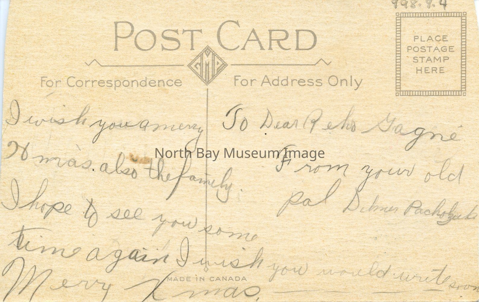 The back of the card has a hand written message in pencil. The address is also written in pencil. It appears as though this postcard was never sent.Creator