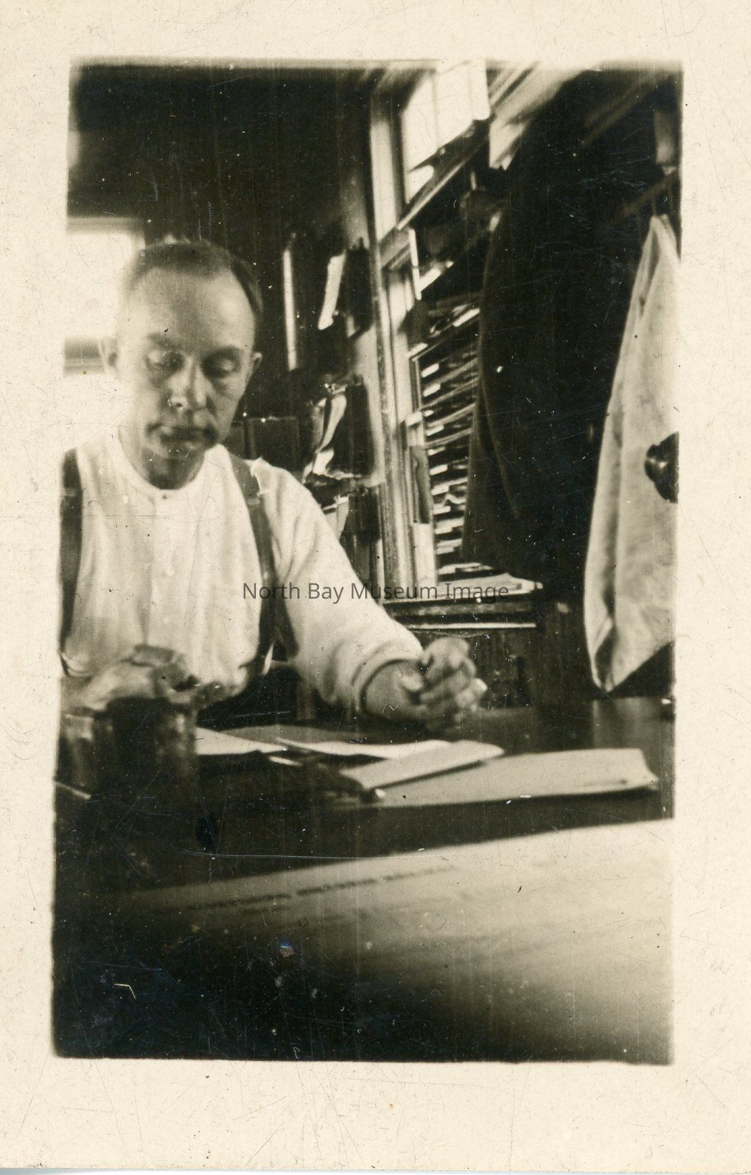 Photograph of Frank Elston siting by desk as a young man.
