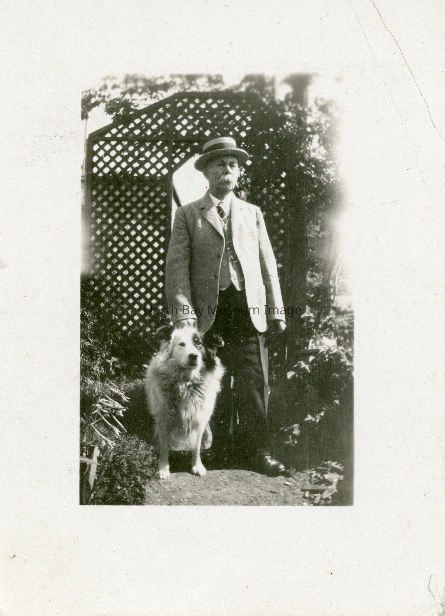 Fred Elston (Frank's Father) standing with family dog. Fred came to North Bay in 1907 and was an art dealer out of his home.