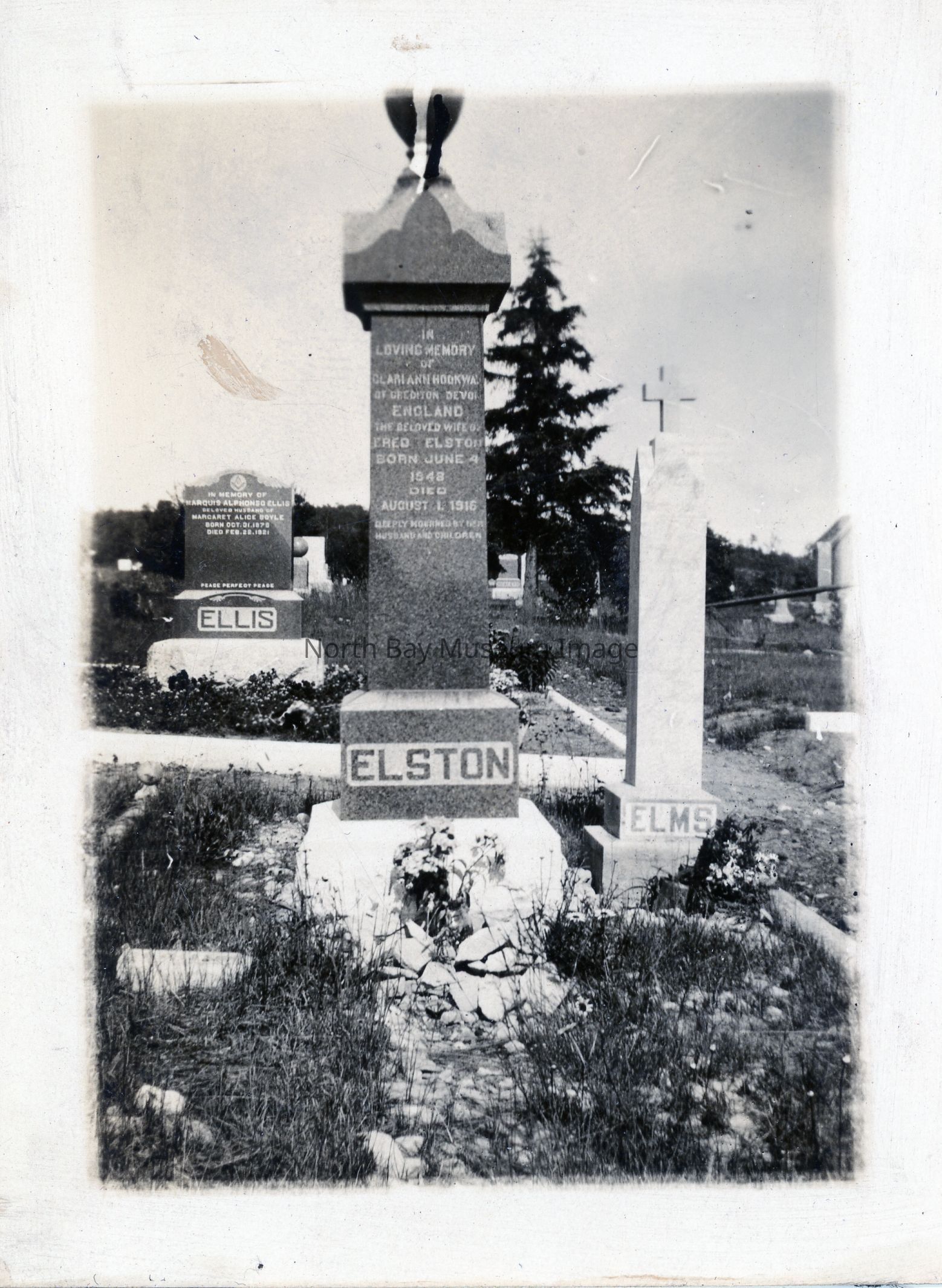 Fred Elston's gravestone and Clari Hooway Elston's gravestone at St. John's Anglican Cemetery. Fred Elston died in 1916 and was born in 1848.