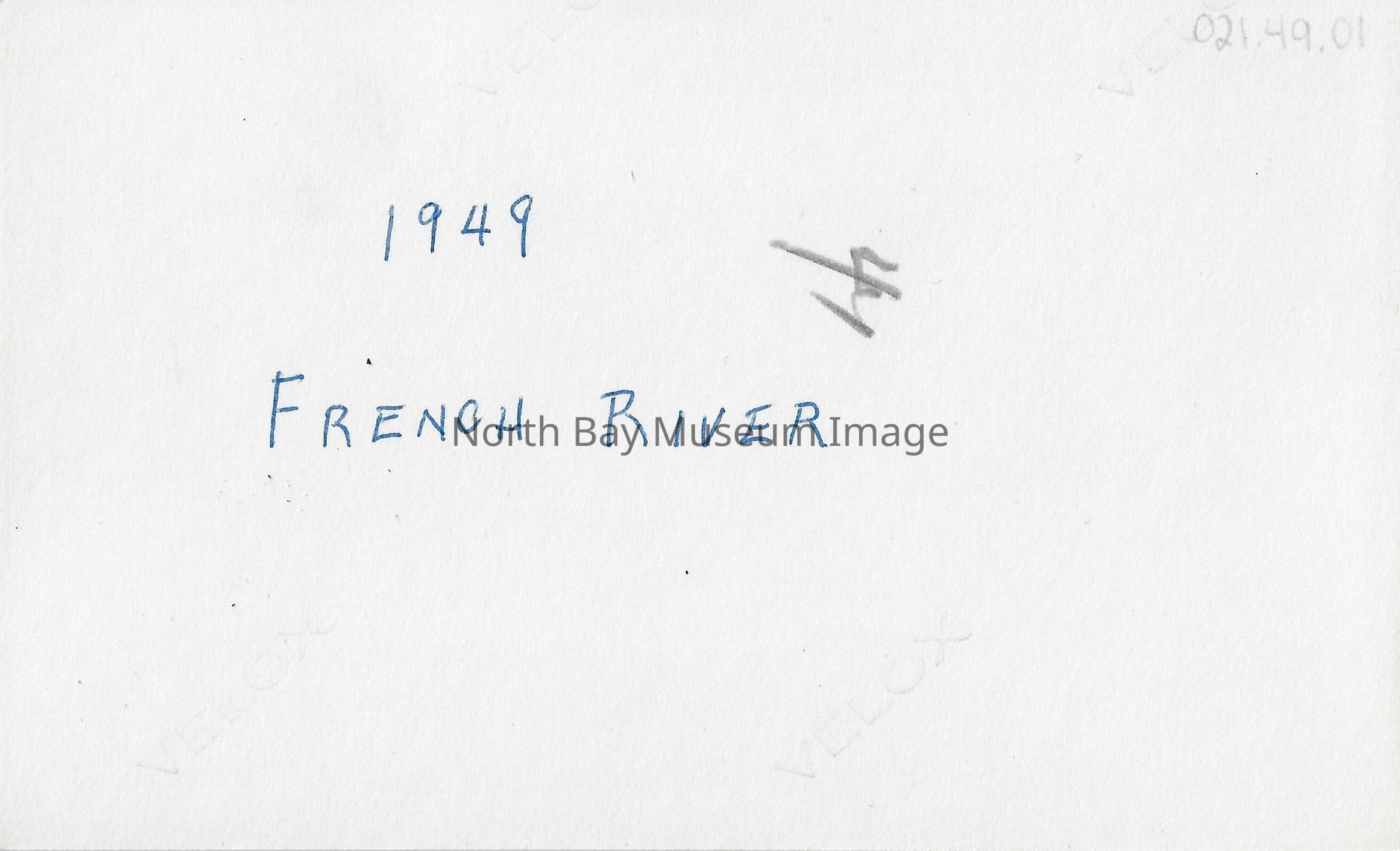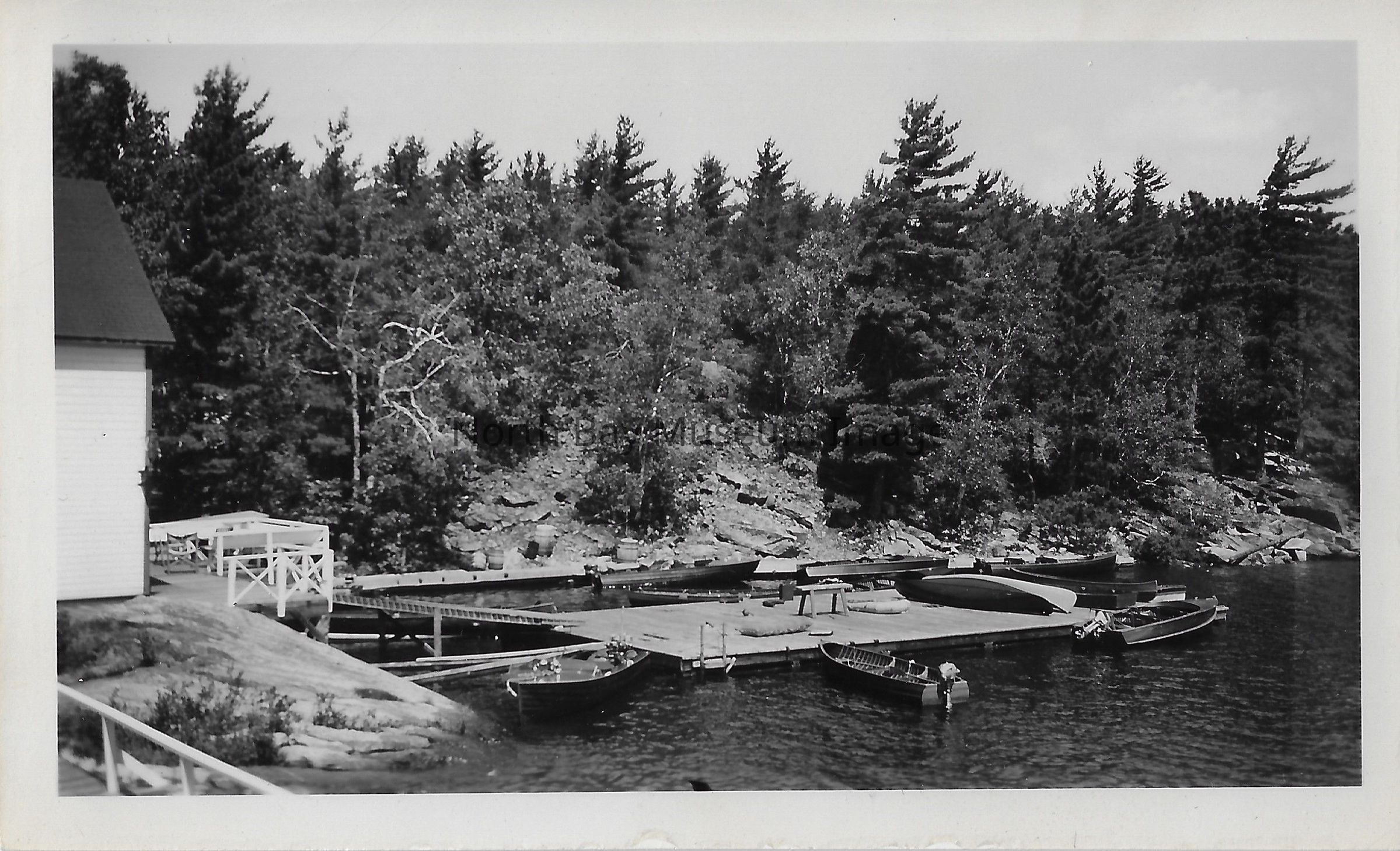Black and white photograph of a dock in French River. A few different boats are in shot, including a canoe. A white building is also seen on the far left hand side of the image. The text on the back says, "1949. French River".