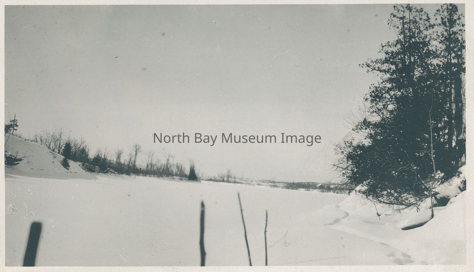Print, Photographic - black and white photograph with matte finish - shows a frozen, snow-covered river - 'Velotene Kodak Prints Made by Strain's Ltd. Winnipeg' stamped on back in purple ink