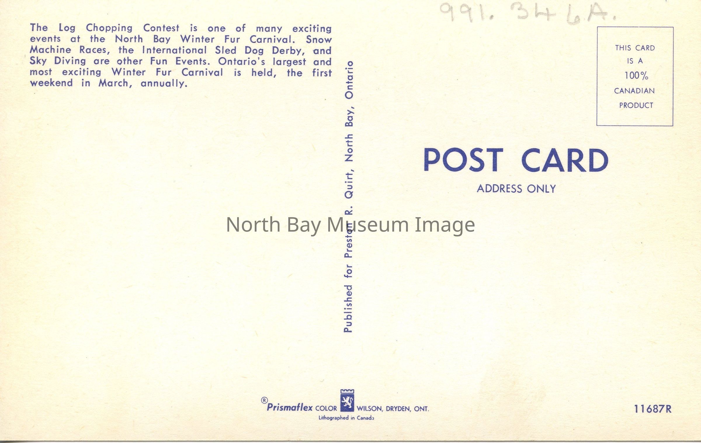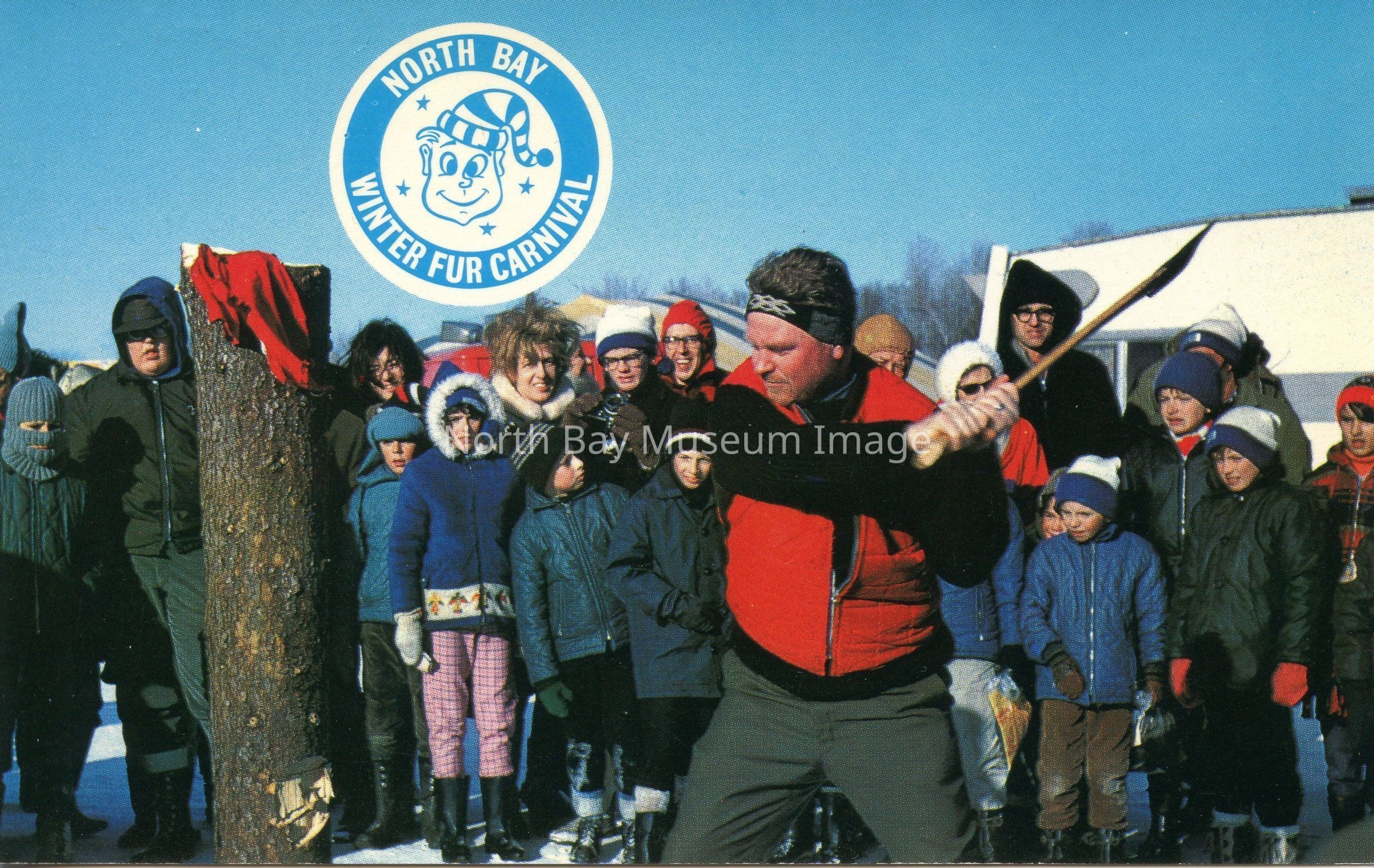 5.5 x 3.5 colored picture post card. North Bay Winter Fur Carnival motif at the top of card. The postcard is of a crowd of people watching a contestant in the log chopping contest as he swings an axe. Circa 1960s
