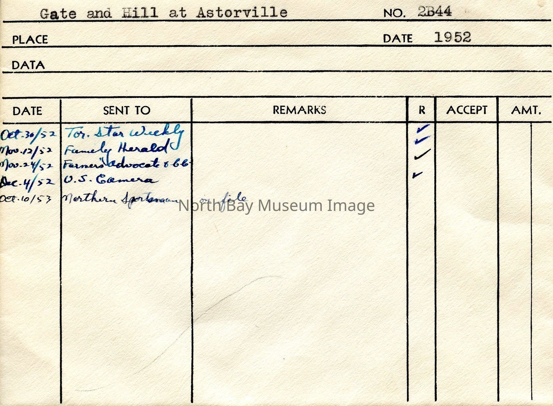 Envelope (a) containing photograph and negative (b-c) of Gate and Hill at Astorville. The image shows a image of three individuals on top of a hill in the wintertime near a fence. A part of the Forder Collection. The photographers original number is 2B44. All of the photographs publications are listed on the the envelope.Creator