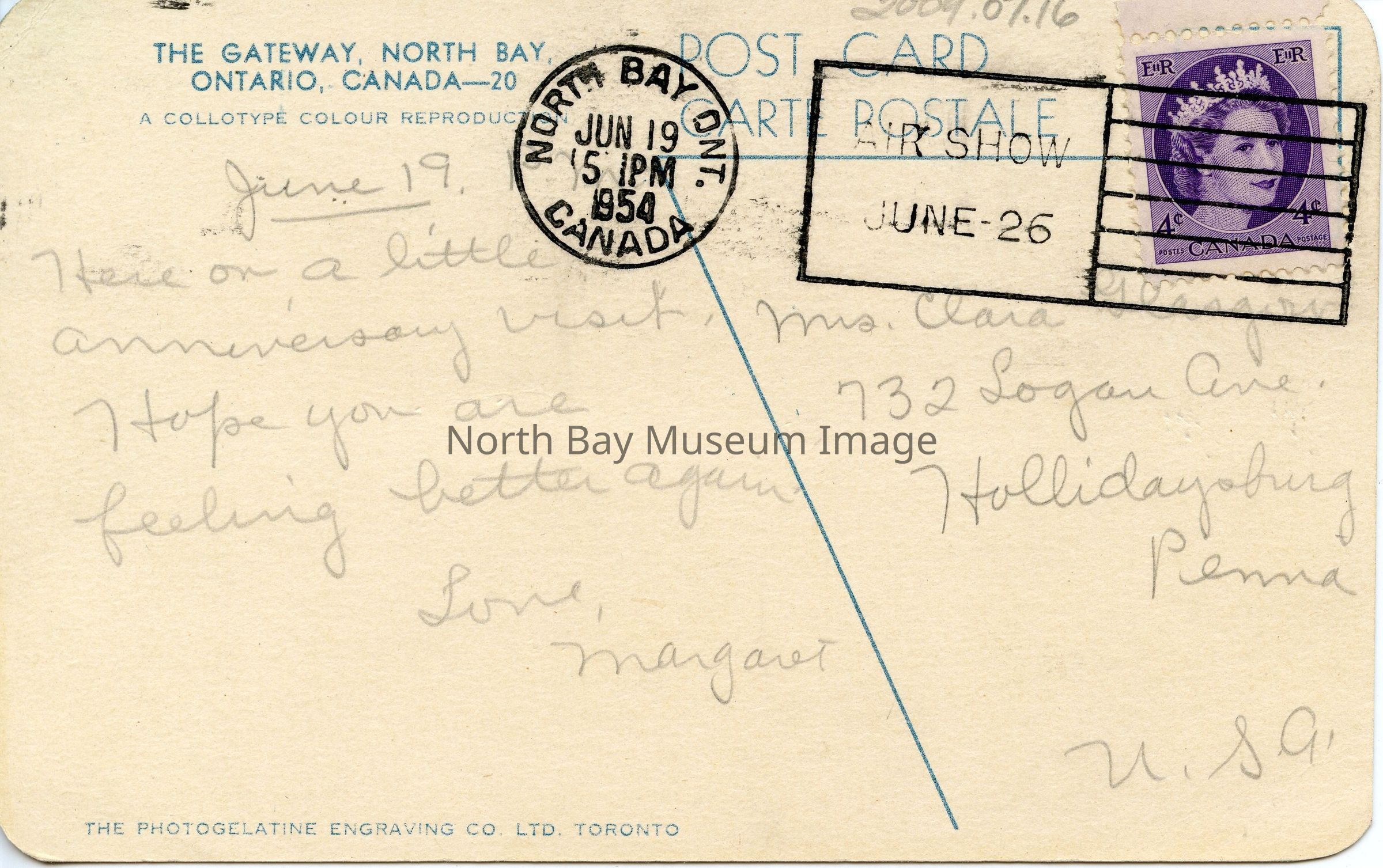The postmark reads "North Bay, Ont. Canada Jun 19 5 p.m. 1954." The rectangular post mark says "Air Show June 26." There is a purple 4c stamp of a young Queen Elizabeth 11 on the postcard. There is also a message written in pencil reading, " June 19 Here on a little anniversary wish . Hope you are feeling better again Love Margaret." This postcard is addressed to "Mrs. Clara Geason ? 732 Logan Ave., Hollidaysburg, Penn. USA.."Creator