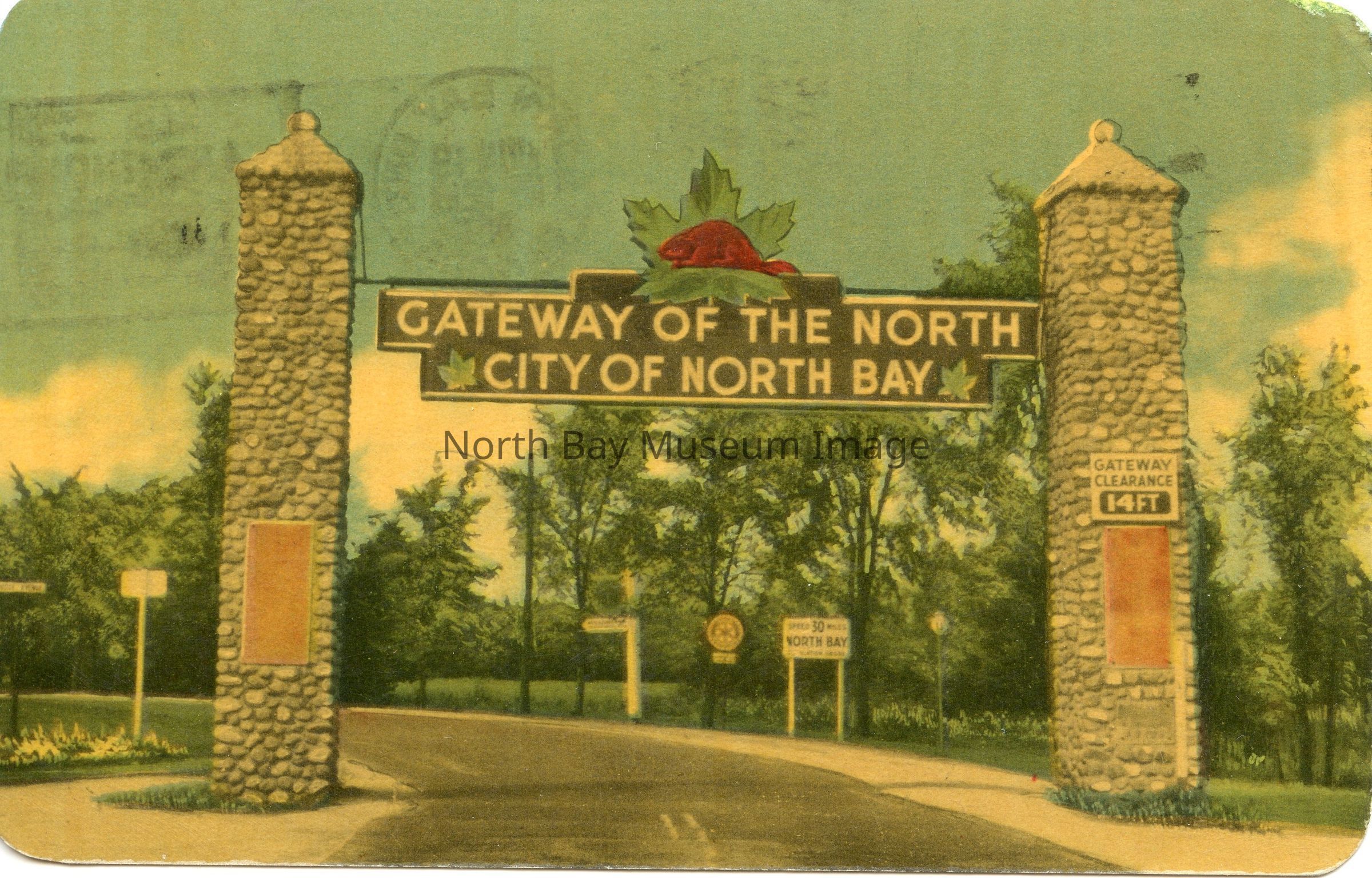 This coloured postcard shows an archway consisting of two stone pillars with a black span saying "GATEWAY OF THE NORTH CITY OF NORTH BAY" with the illustration of a brown beaver on top with a green maple leaf illustration. The Right hand pillar says "Gateway Clearance 14 ft." Behind the right hand pillar is a sign saying "speed limit 30 North Bay." Also seen is the Rotary Crest. This span was erected by The Associated Commercial Travelers and spanned Monk St but is now residing, after many changes, in Lee Park.