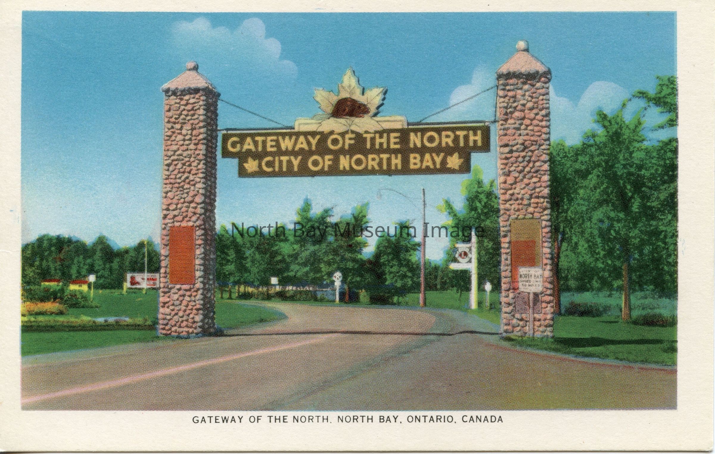 Postcard with color photo of North Bay's famous Gateway of the North, originally built in 1928 by the North Bay Travellers. Located now in Lee Park, it used to welcome visitors on Highway 11 (Lakeshore Dr.), when it was commonly referred to as the Toronto Highway. Above the sign an image of a beaver faces right on a maple leaf surround.