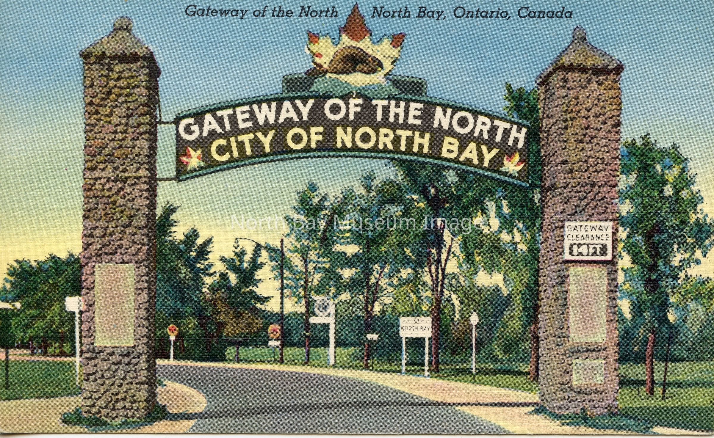 The front of this postcard has a bright coloured photo of the "GATEWAY OF THE NORTH CITY OF NORTH BAY" arch. The arch is inbetween two stone pillar. The gateway spans Monk Street and running into Lakeshore Drive. The sign has coloured maple left on top with a beaver in front of it. On the right hand pillar there is a sign saying Gateway Clearance 14 ft. Also on the right hand side of the road is various signs including: Hwy. 11, North Bay speed limit 30 miles an hour, Lions (service club) symbol, and 3 other signs.