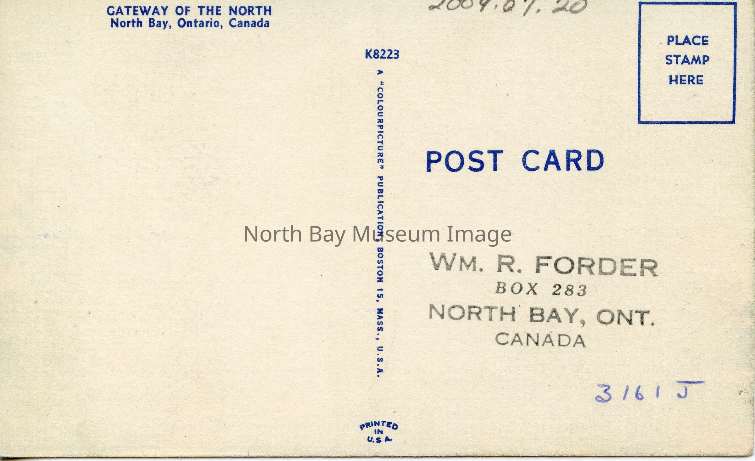 On the back of the postcard is a part of the Wm. R. Forder, Box 283, North Bay, Ont. Canada (avid post card collector and donor) collection. This postcard is stamped. This postcard is Printed in USA K8223. 3161J is written in the lower right hand corner in penCreator