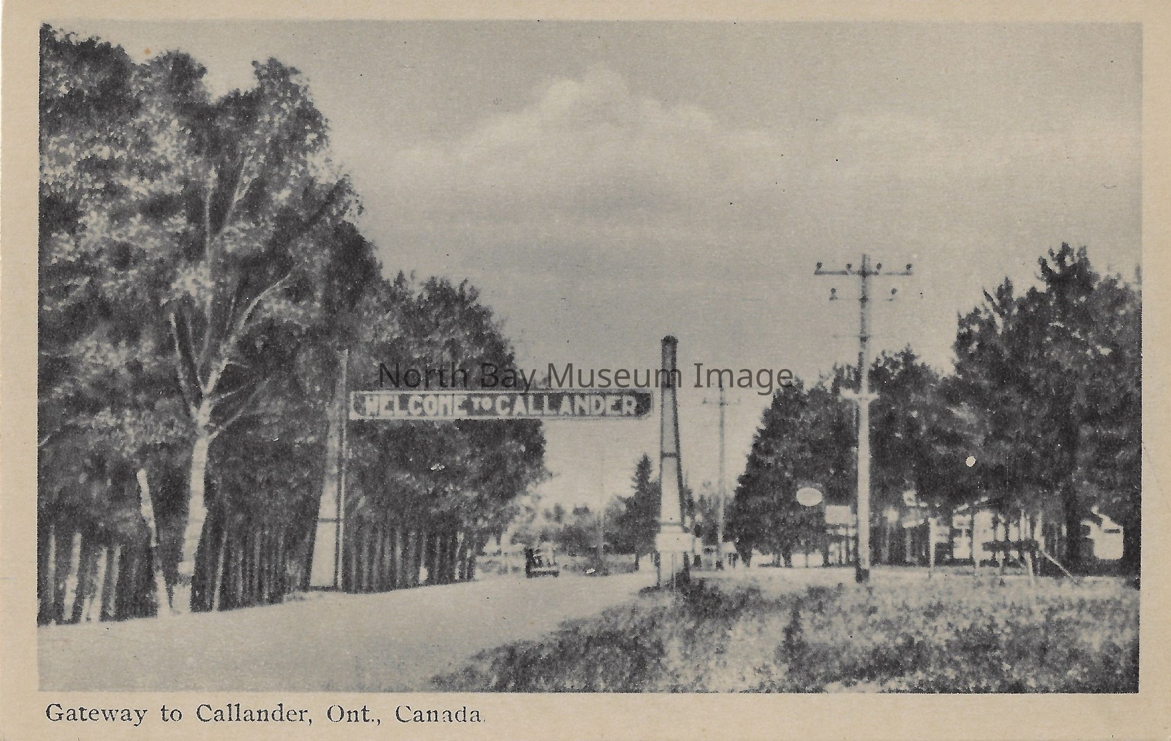 Black and white postcard showing "Welcome to Callander" sign and street scene showing old car, possibly power lines and buildings, captioned "Gateway to Callander, Ont., Canada." There is a road going under the Callander sign. The sign is surrounded by a wooded area. Back inscription: "home of Dionne 'Quints'".Date(s) of Creation