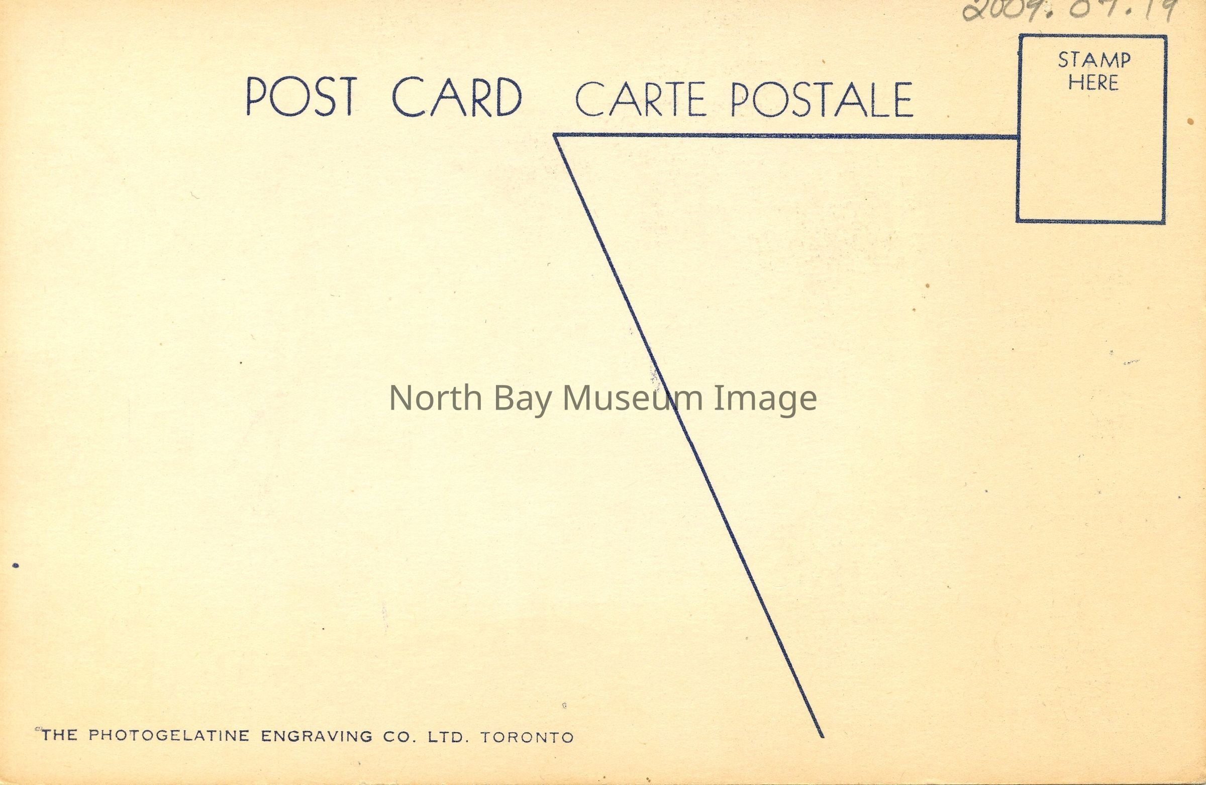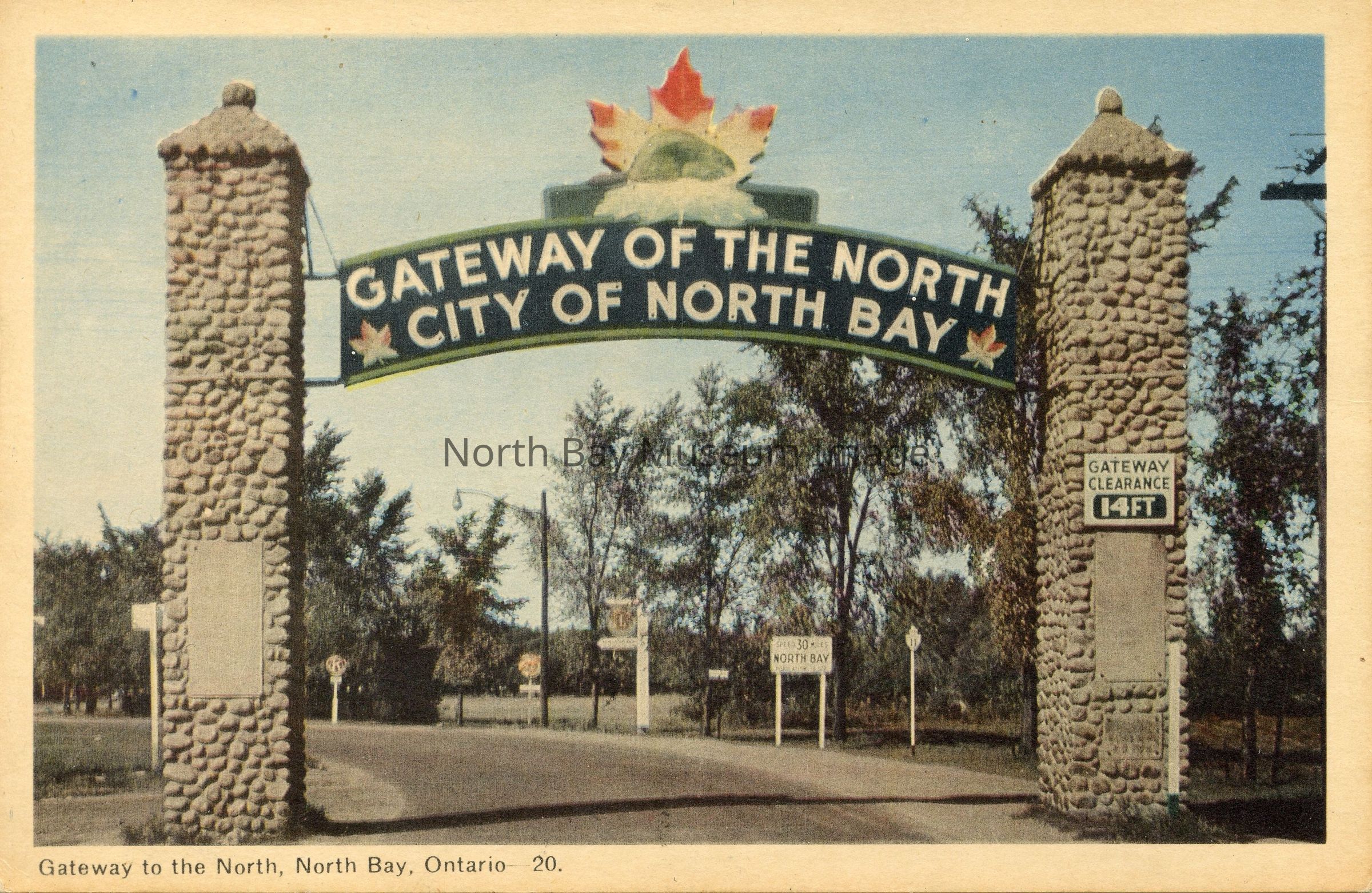 This is a coloured postcard with a picture of the gateway arch spanning Monk St. Running in Lakeshore Drive. The Span says GATEWAY OF THE NORTH CITY OF NORTH BAY, and is inbetween two stone pillars and have a coloured maple leaf on top with a beaver in front. In the right hand side there is a sign saying gateway clearance 14 ft. There are also various signs are beside the road including: highway 11, North Bay 30 miles an hour, and two service club signs.