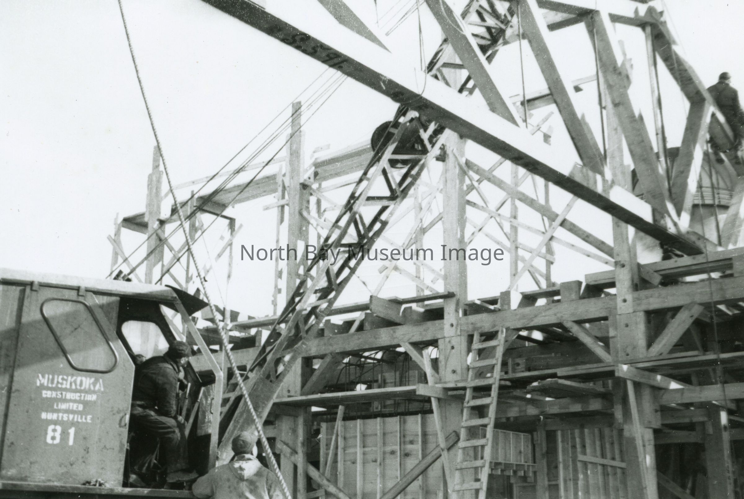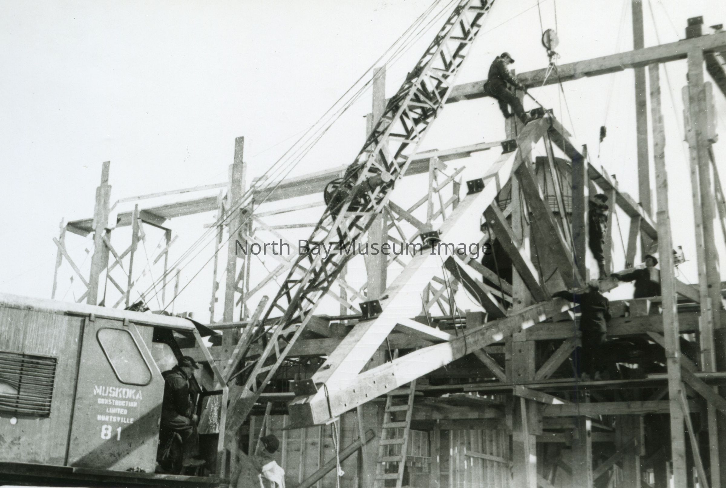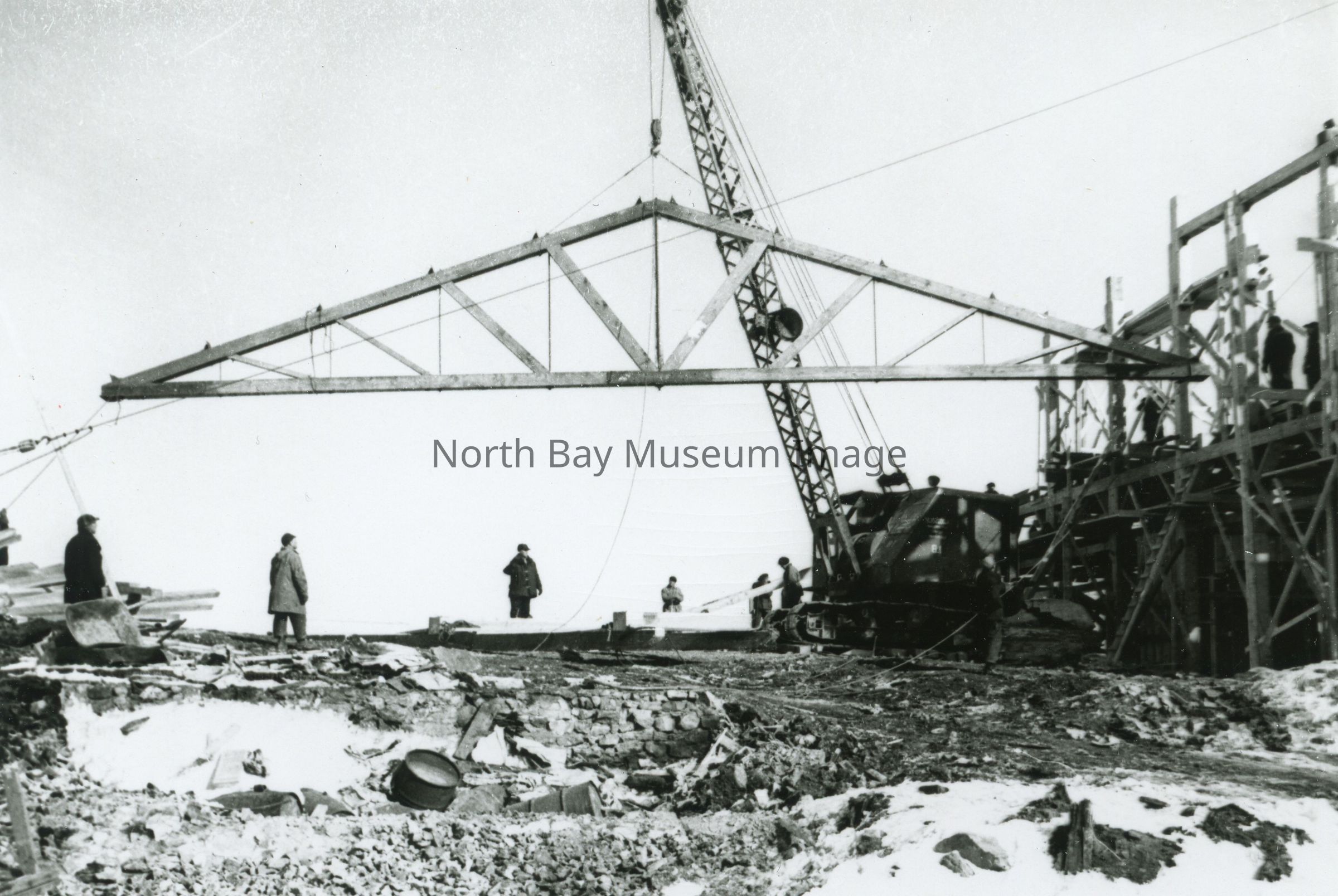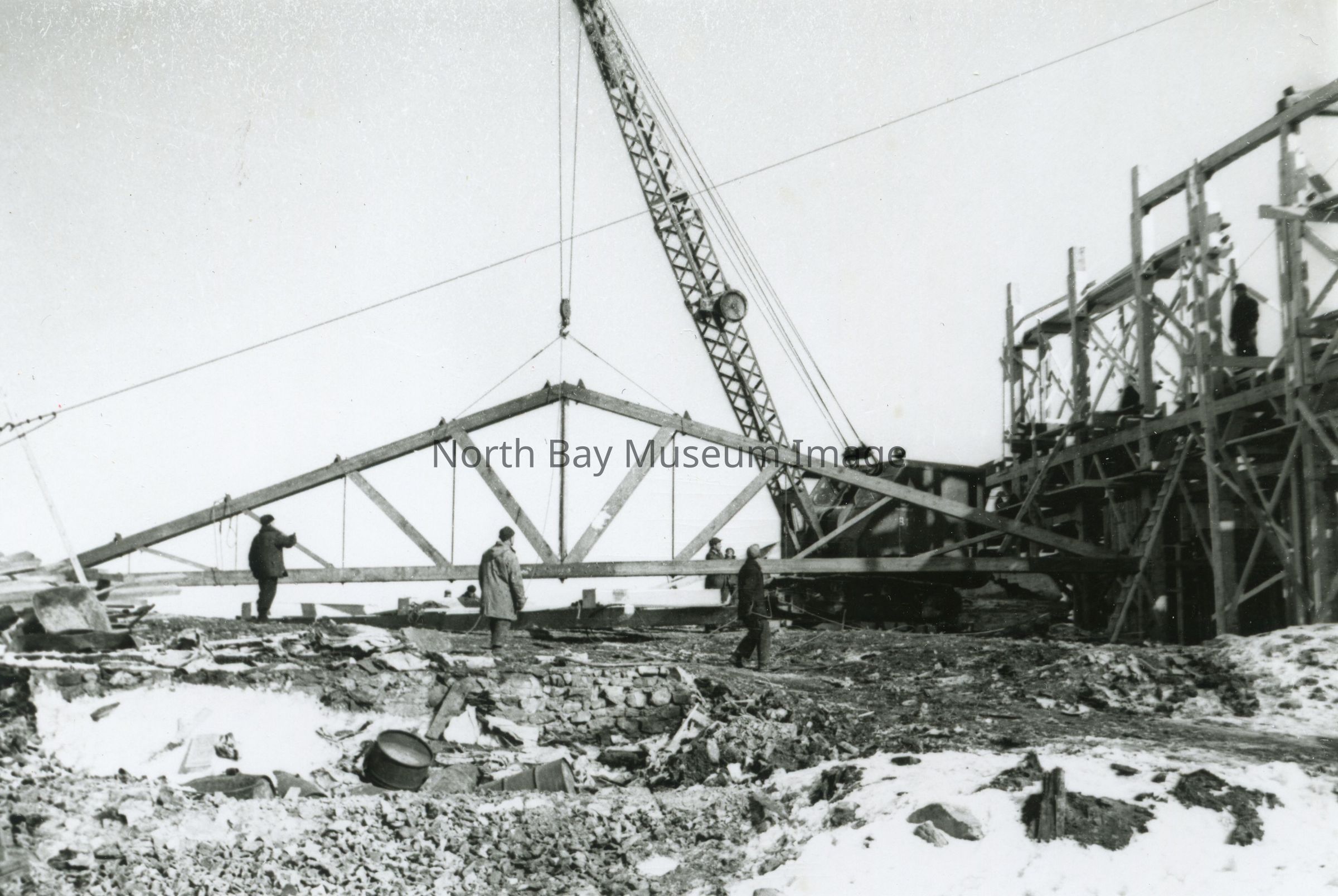 - Picture (b) shows a large crane lifting a piece of the rafters.