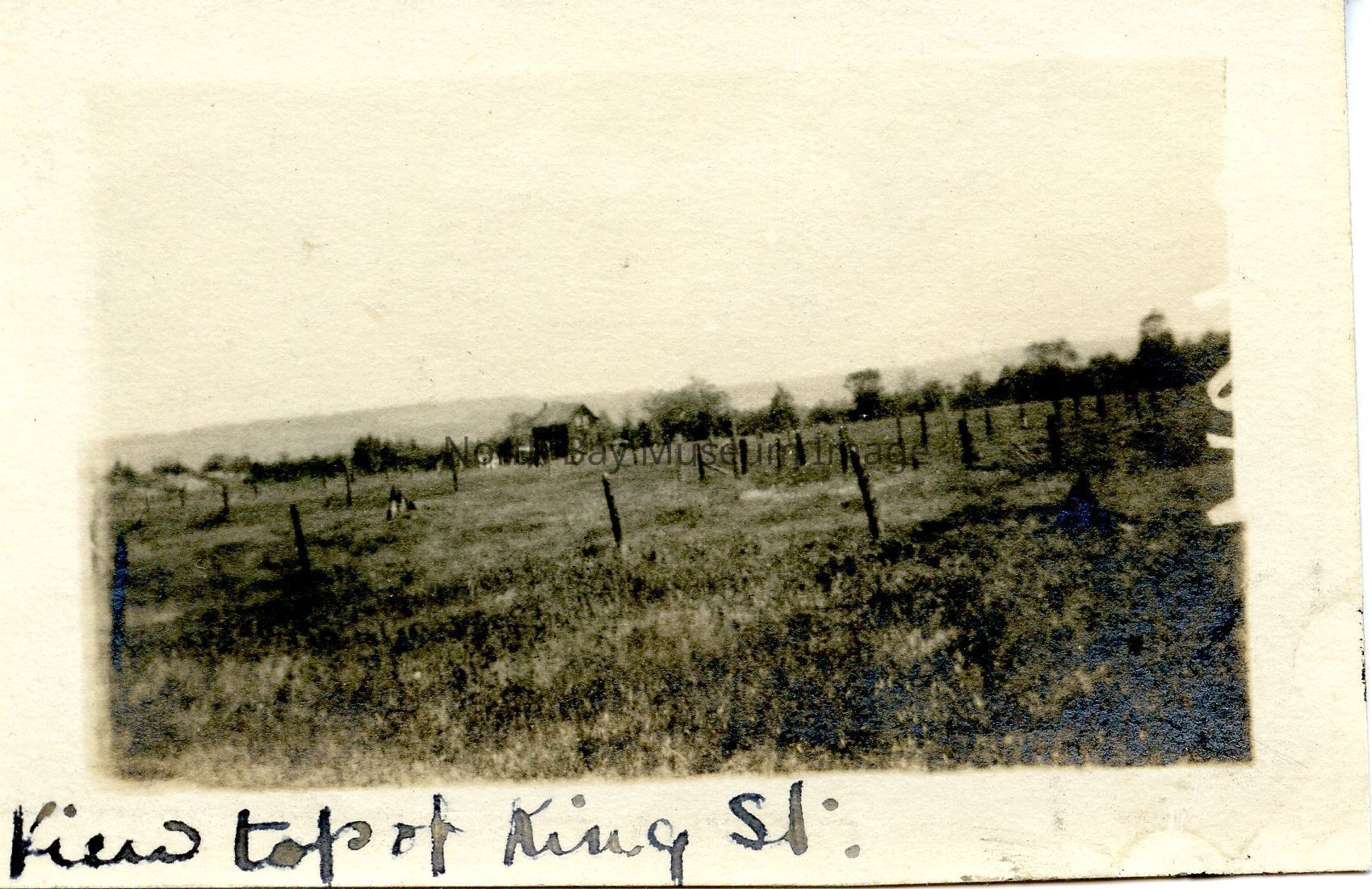 Black & white photograph from the top of King St. 2.3 x 1.3. Fields marked off with posts and one house.