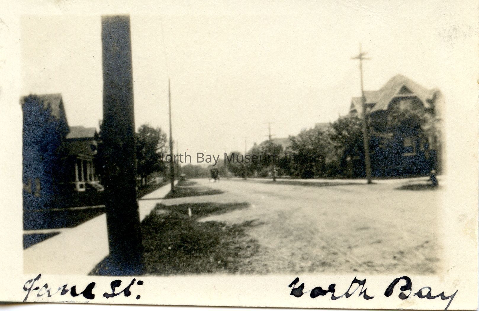 Black and white photograph of Jane St., North Bay. A wagon is visible on the road in the distance.
