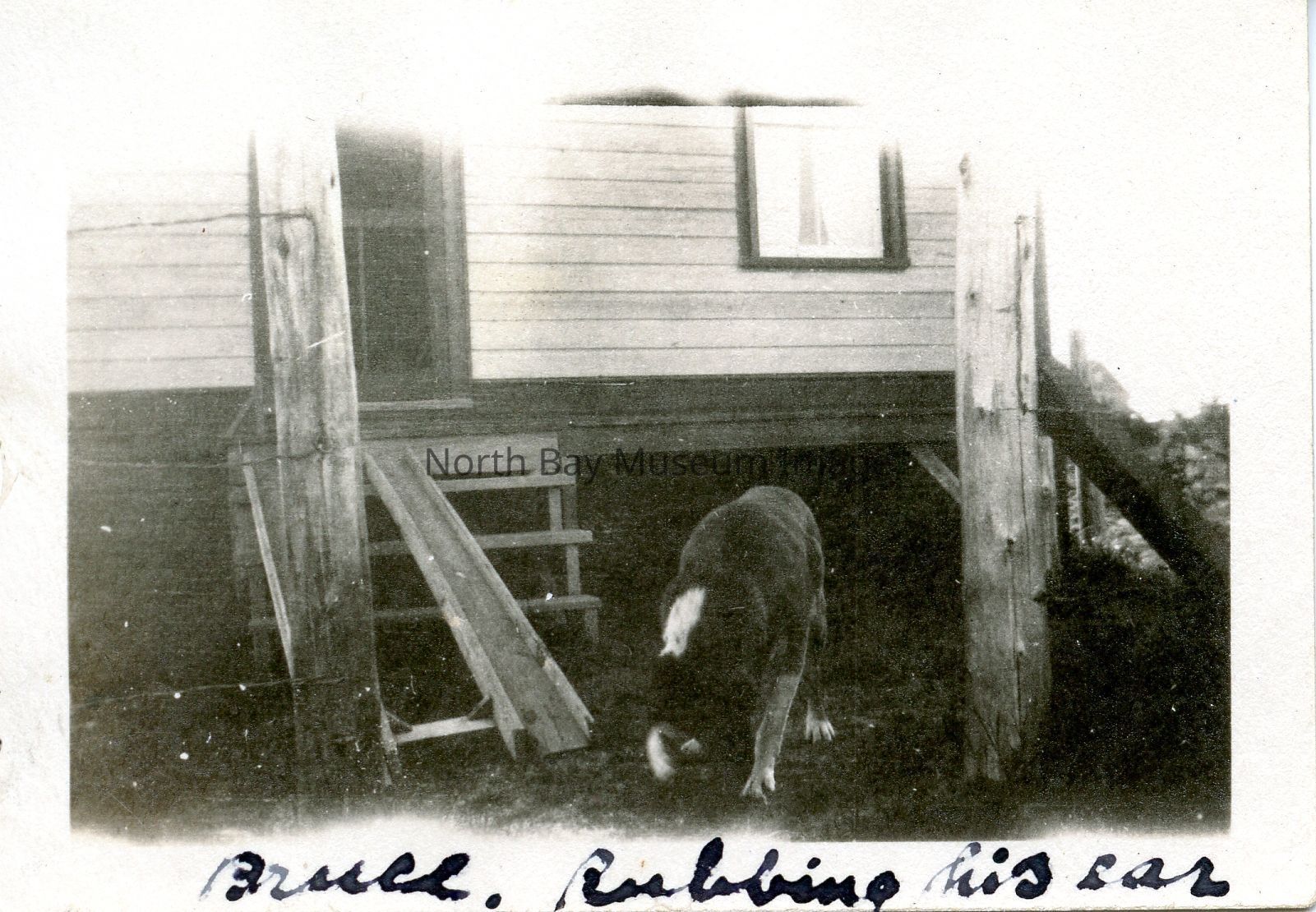 Black and white photograph of Bruce (Alec Tweedie's dog) rubbing his ears, pet dog is in the back of Tweedie house