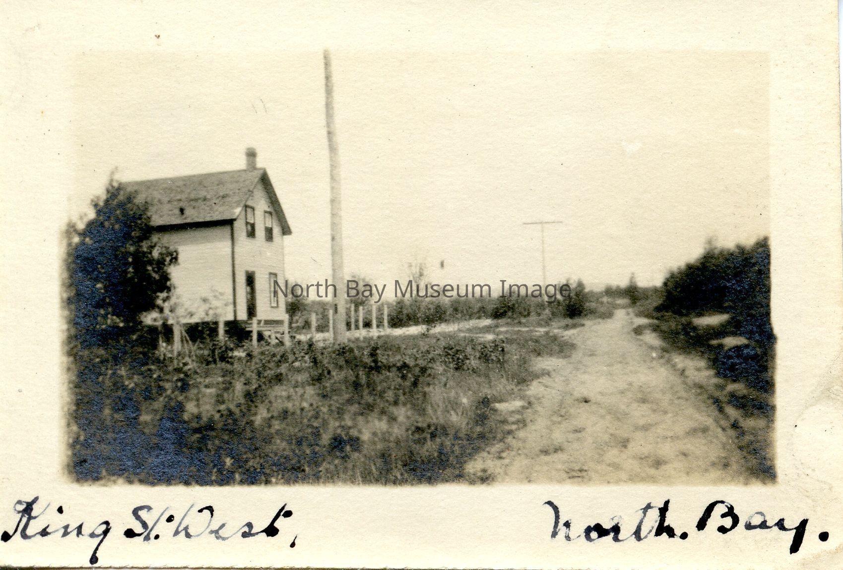 Photograph of King St. W; in North Bay. - Black & white. - 2.3 x 1.3. - View of King St. West, North Bay. - Tweedie house on left.