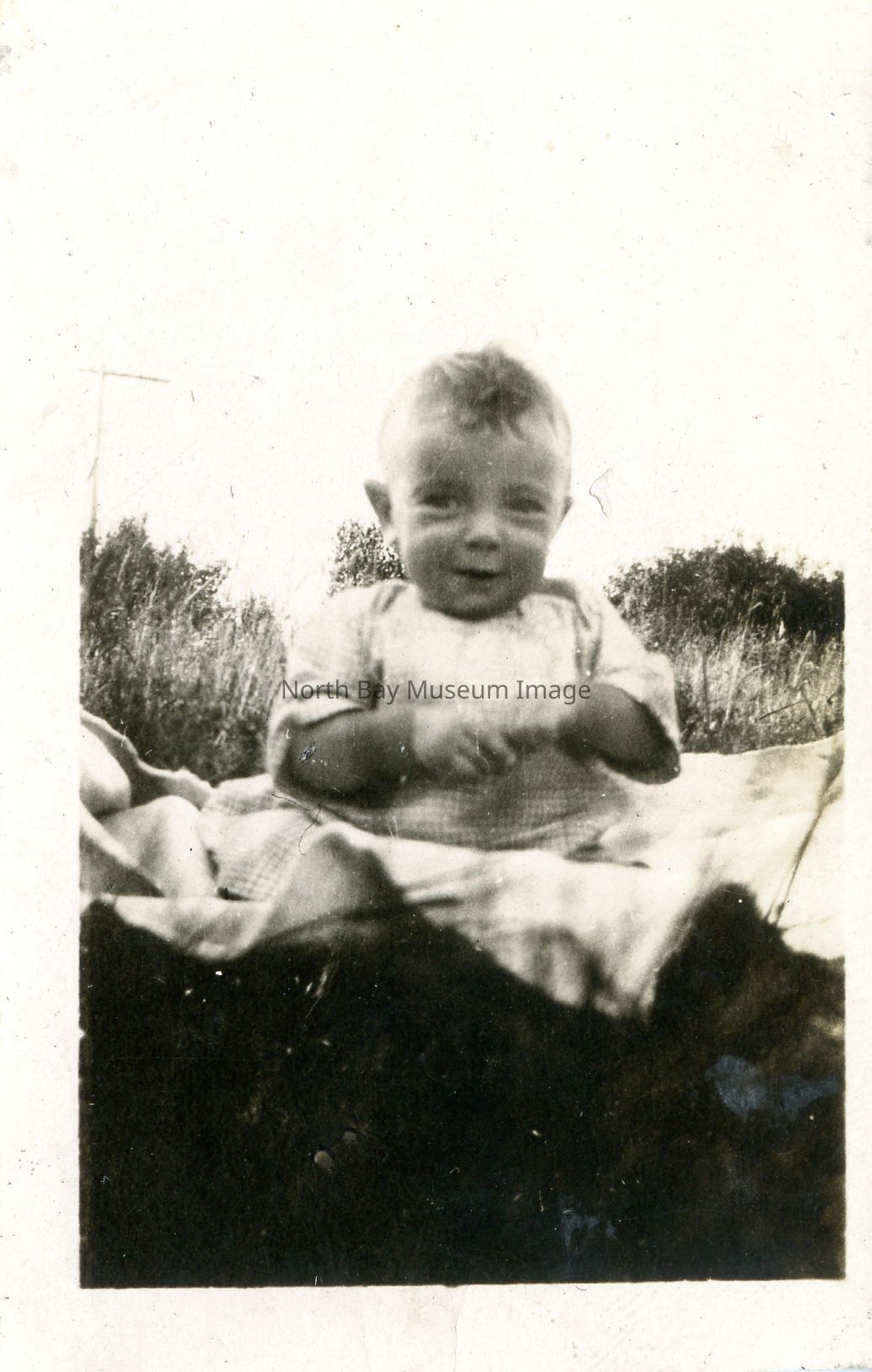 Photograph of Alec Tweedie sitting on a blanket in the yard - Black & white. - 2.3 x 1.3.