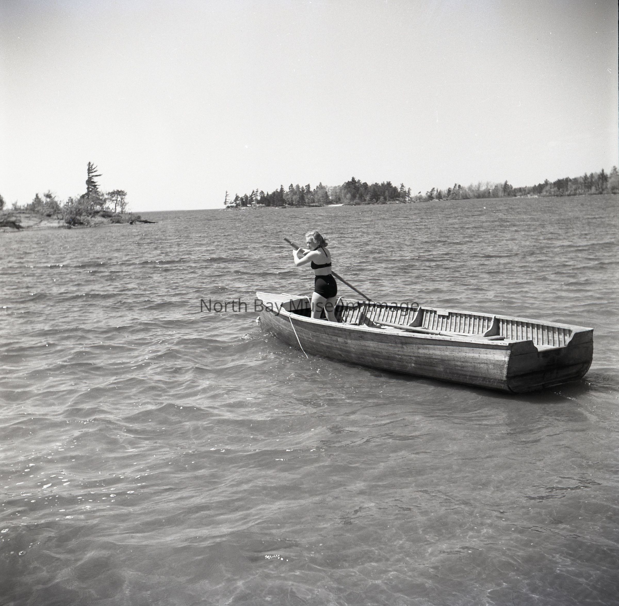 Envelope (a) containing negative (b) and photograph (c) of a girl in a row boat. The image shows a girl rowing away from the photographer in quite shallow water, at sunset cove. A part of the Forder Collection. The photographers orignal number was 4D10. All of the publications of the photo are listed on the envelope.Creator