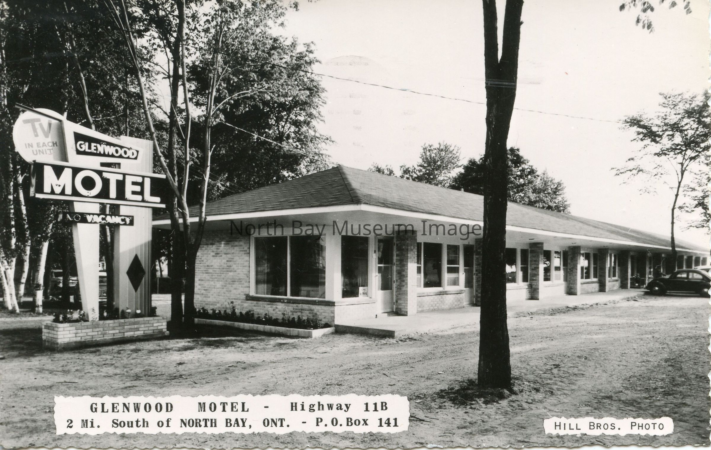 Postcard with B&W photo of Glenwood Motel, located on Highway 11B (now Lakeshore Drive), North Bay. Current address of this motel is 467 Lakeshore Drive. Parking area in photo is unpaved with tree in the middle of the driveway. 1950s-era automobile parked at right edge of photo. Sign at front of motel reads: Glenwood Motel, Vacancy, TV In Each Unit. Motel building looks brand new in this photo.