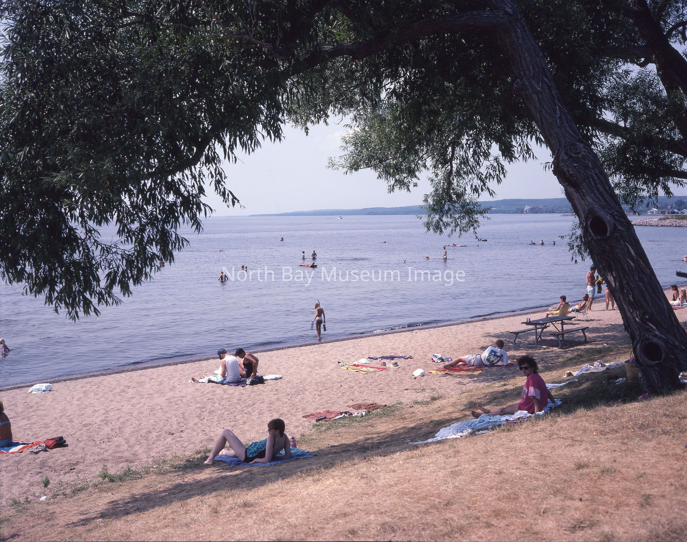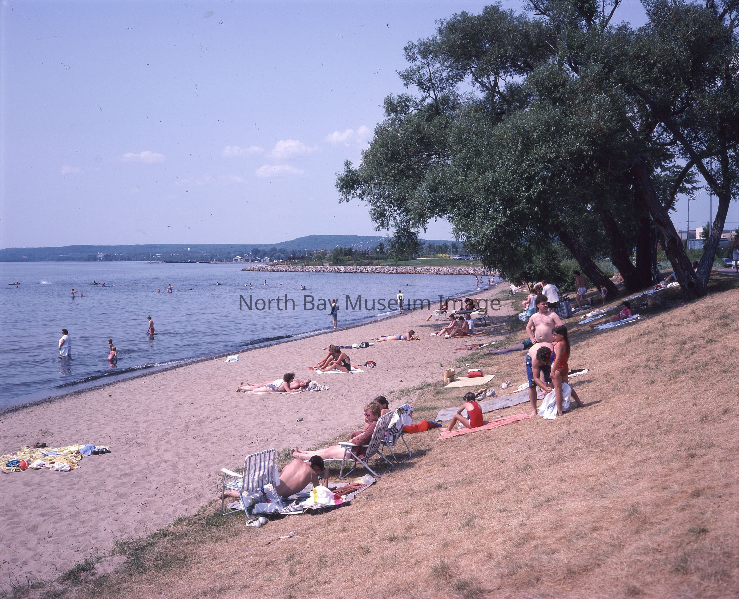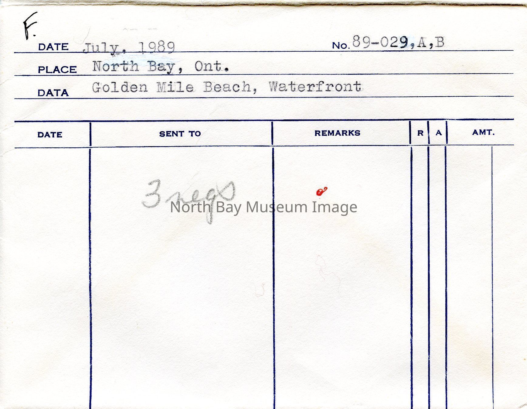 Envelope (a) containing negatives (b-d) of Golden Mile Beach in North Bay Ontario. Photos consist of people on the beach both swimming and sunbathing. A part of the Forder Collection.Creator