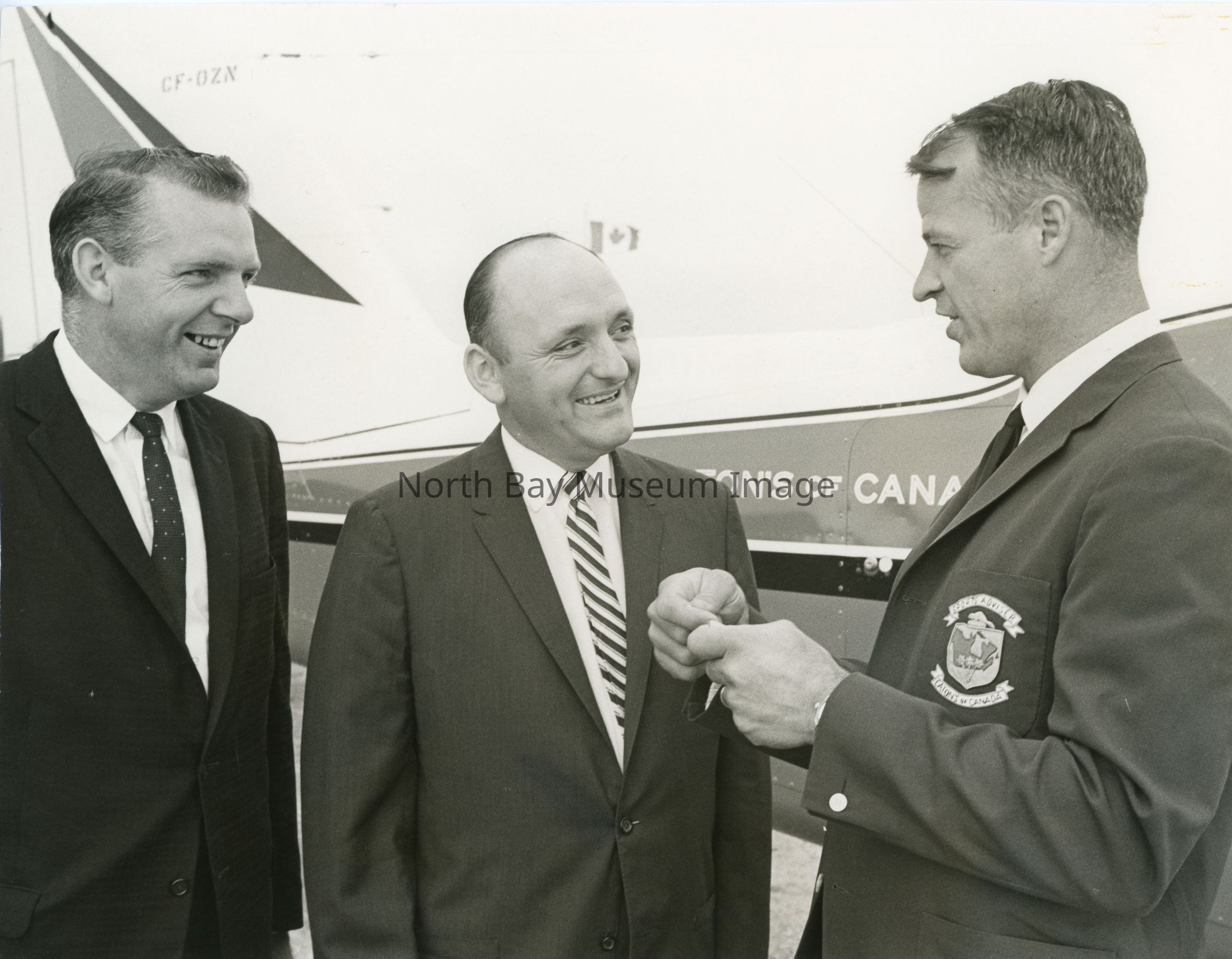 Photo of Elroy Sylvester (manager of Eaton's) with Gordie Howe and Eaton's reps at North Bay Airport. Elroy Sylvester is in centre and Gordie Howe is on right wearing a blazer badge that says Sports Advisers, Eaton's of Canada. Gord Elliott, who also worked for Eaton's, is on the left. Howe was the advisor for a few years and wore a red blazer which is seen in this photograph. More info available at Archives of Ontario Eaton's fonds. North Bay community members have commented on social media that they remember Howe signing autographs at the Eaton's store in North Bay.Date(s) of Creation