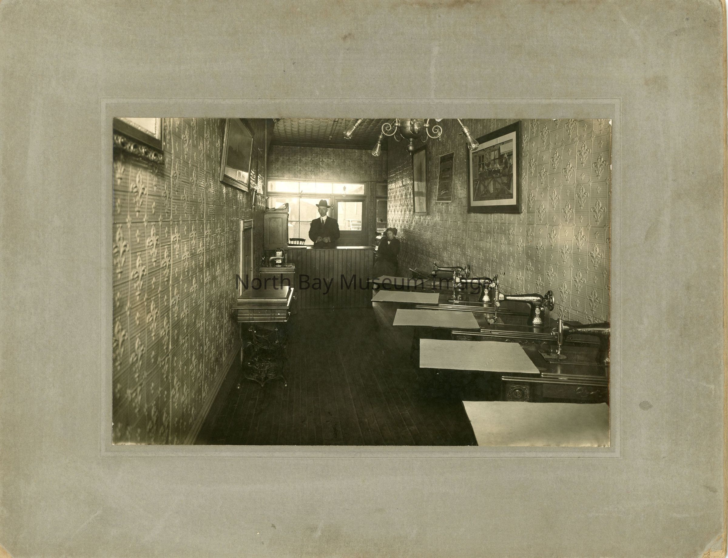 John Thomas Lovell moved to North Bay in 1888 and opened a store on 43 Main Street East where he sold Singer Sewing Machines and farm machinery. As the Northern Ontario representative for the Singer Manufacturing Company, he travelled as far west as Sault Ste. Marie on a regular basis. John Thomas Lovell closed the store in the early 1920s before passing away in 1937.