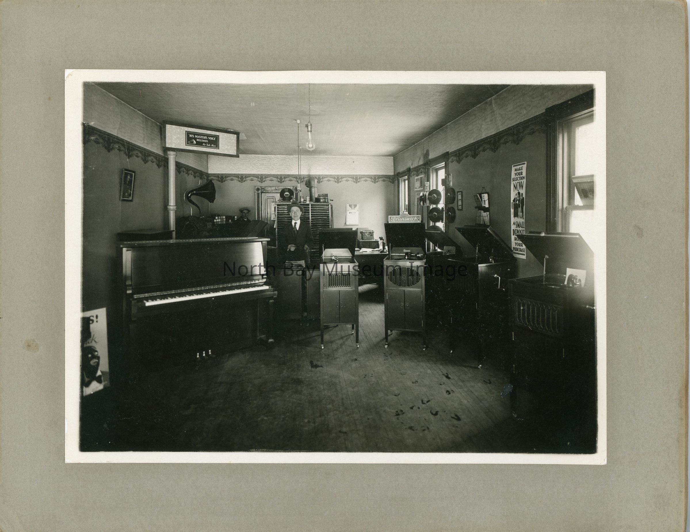 Image of Gordon Lovell in Lovell's Music Store with piano and various record players, records and equipment. Sign in corner of photo says "His Masters Voice" Records for sale here. A poster on the wall says "Make Your Selection Now: A Small Deposit Holds Your Purchase"