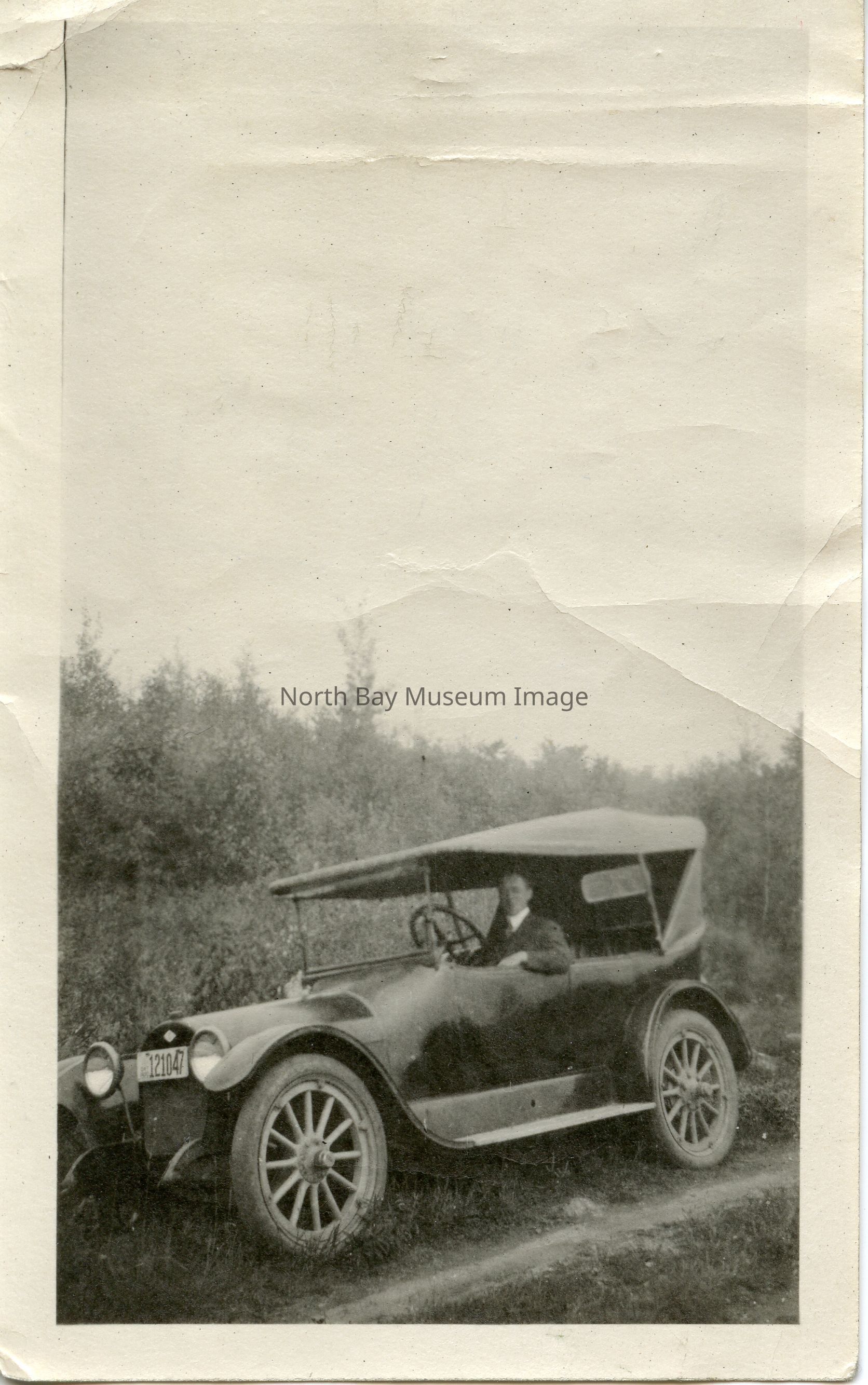 2 copies of photo of Gordon Lovell as a young man in 1920 with his first car, an Oldsmobile with rural background.
