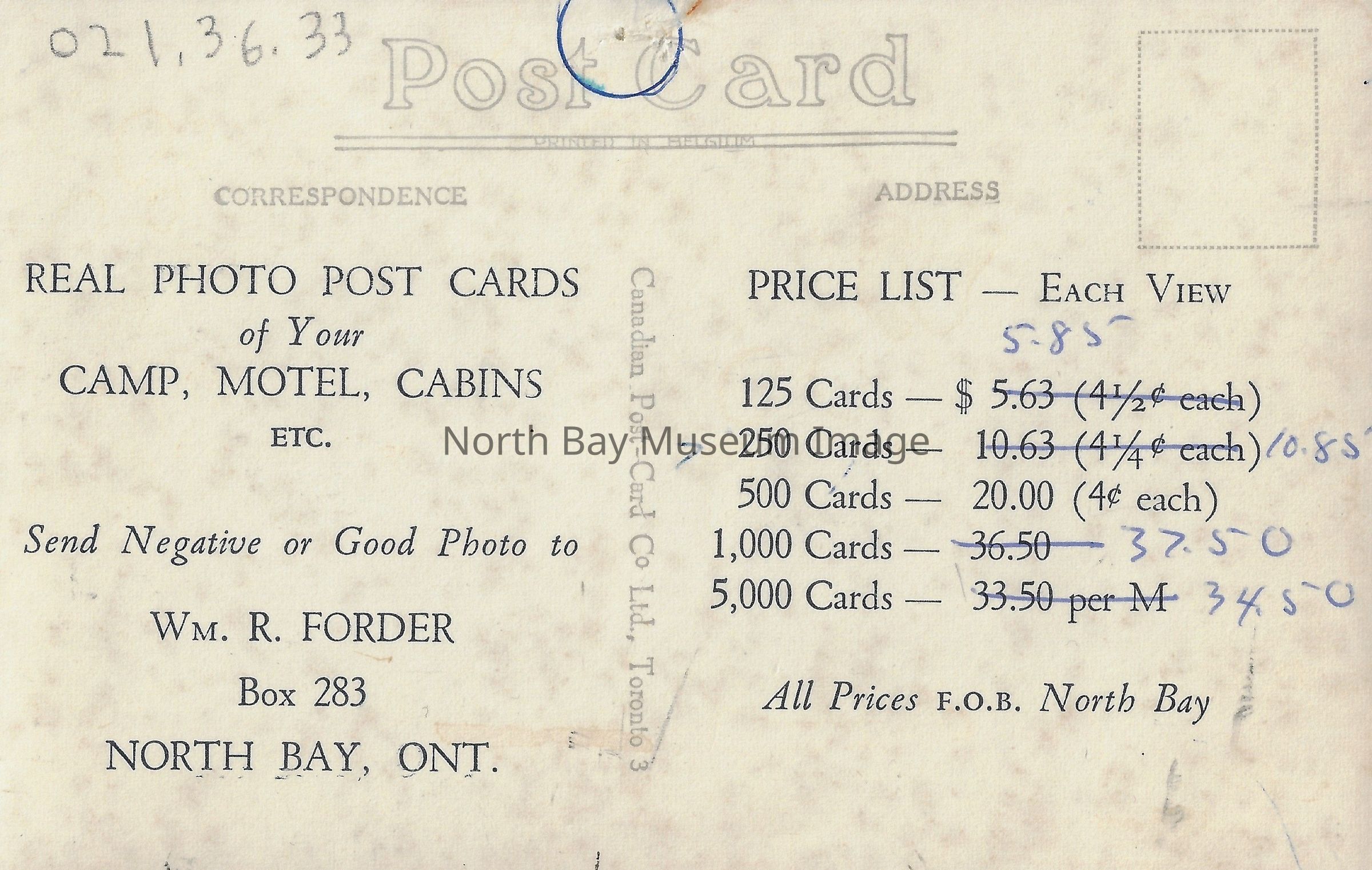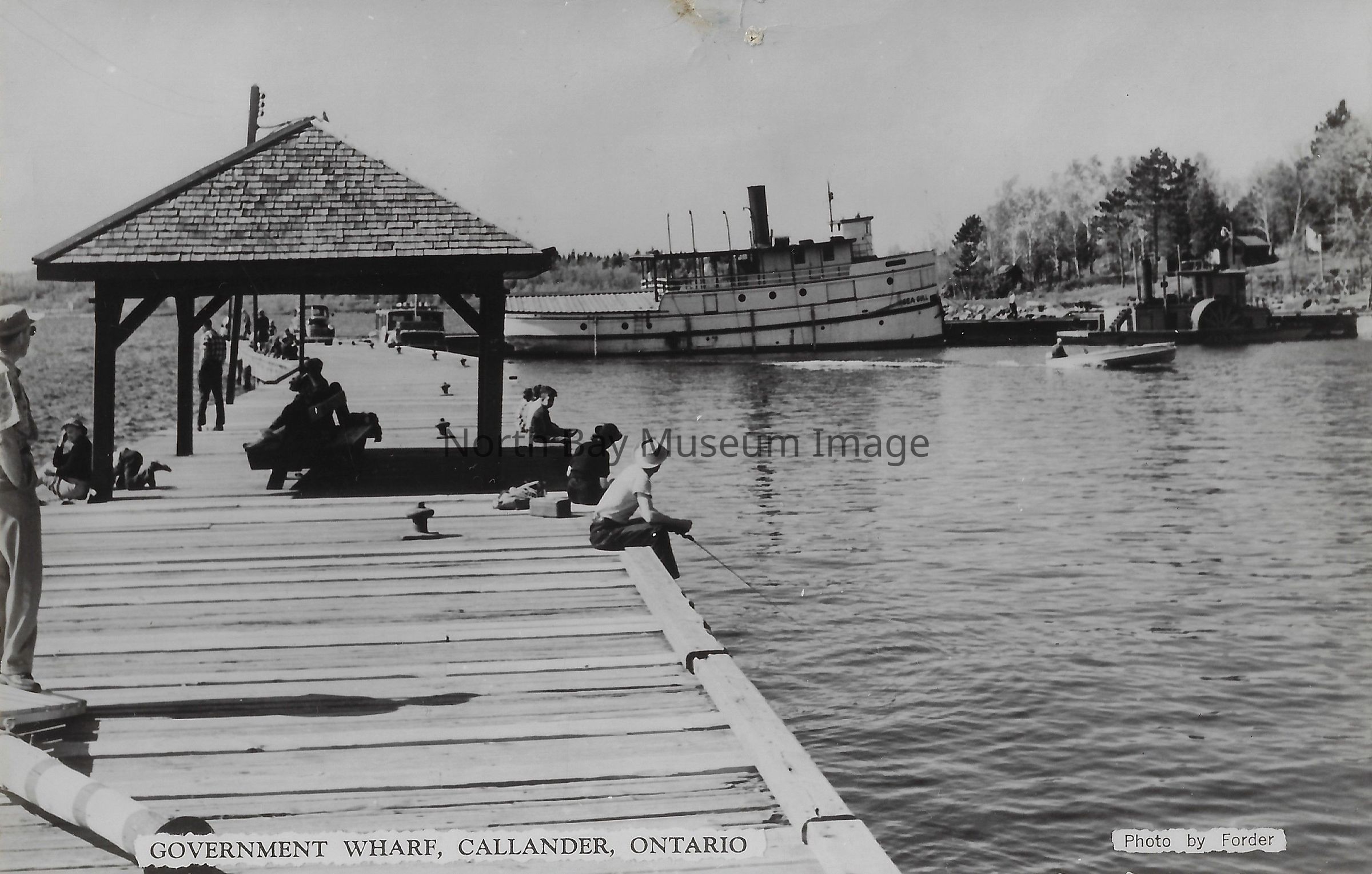 This is a Black and white postcard. The postcard is looking towards a walkway and the lake. There are are many people walking along the wooden pier, fishing and siting with their feet in the water. On the lake there are a few smaller boats, with one bigger boat in the foreground. The postcards Title: "Government Wharf, Callander, Ontario", "Photo by Forder". The back of the postcard has a price list of the postcards taken and sold by Forder.Date(s) of Creation