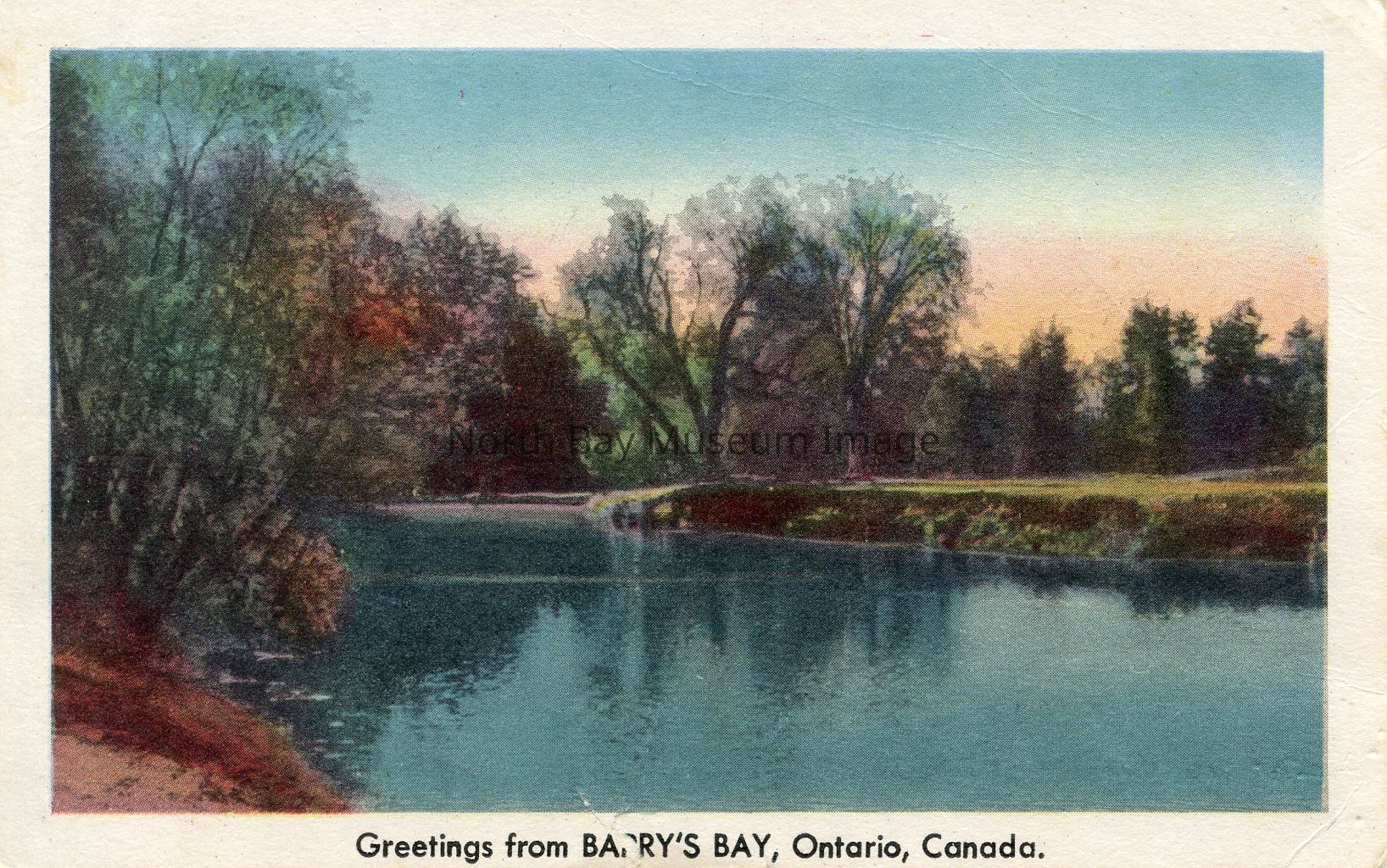 This colourful postcard is of a river scene, Barry's Bay, O.N., Can. The water is blue. The trees around the water are brightly coloured. On the bottom of the postcard black text says "Greetings from Barry's Bay, O.N., Can." The postcard was Made In Canada. On the back there is No message or address. The imahe is Copyrighted, Toronto, Can. And the Stamp area contains G. 5. 6Creator
