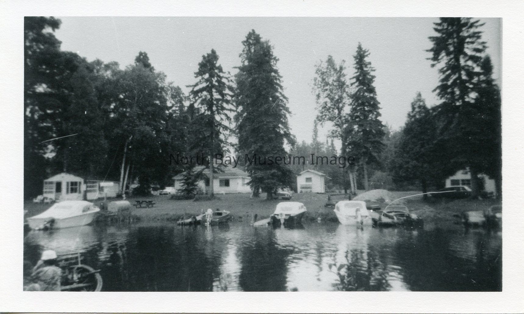 This is a black and white "Greetings from Riverbend" postcard. There are four small white cottages in the background. The photo appears to be taken from the lake. There is a number of small docks in front of the cottages, where a few boats are also docked. Behind the cottages are tall trees surrounding the cottages.
