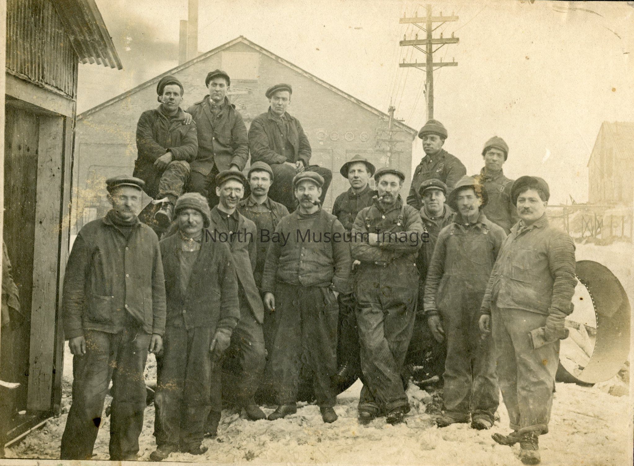 Photo of group outside office, possibly of T&N.O (Temiskaming and Northern Ontario). Men in coveralls and caps.