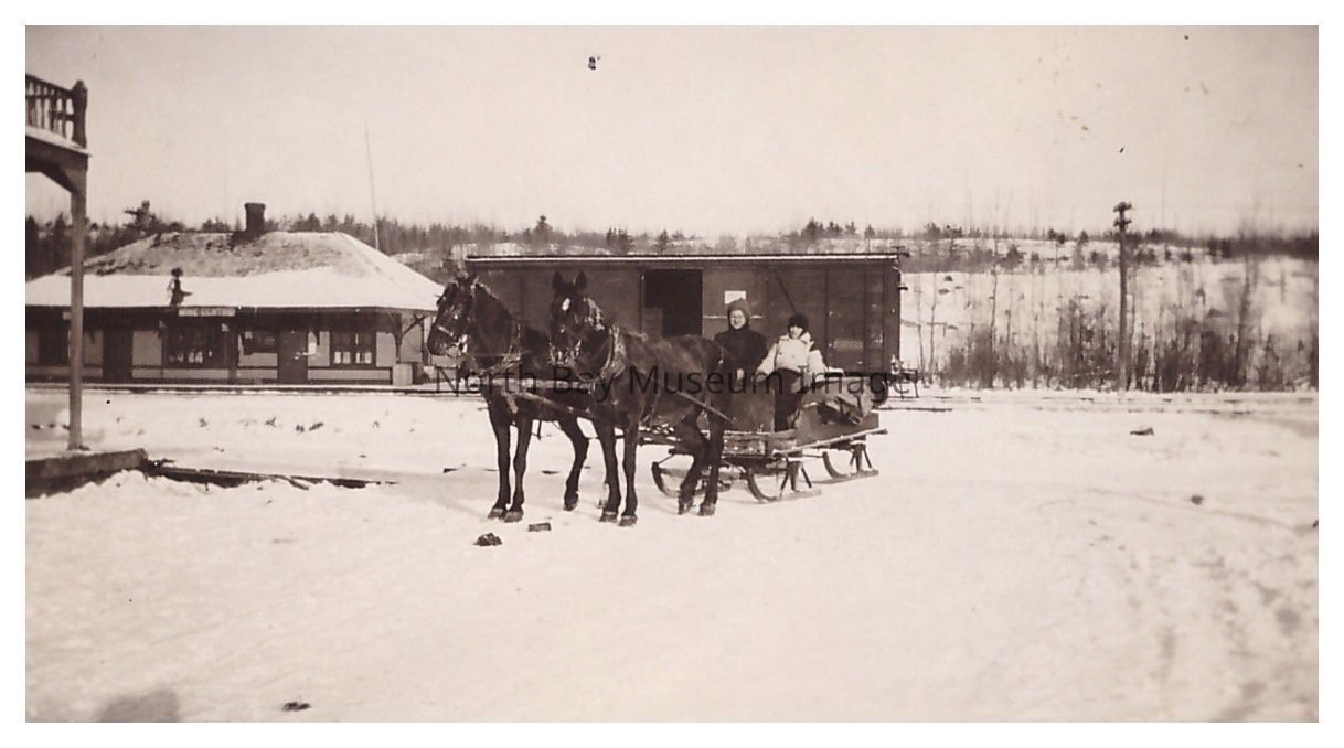 - shows 2 people in a horse-drawn cutter (2 horses) in front of a train station marked 'Mine Centre'