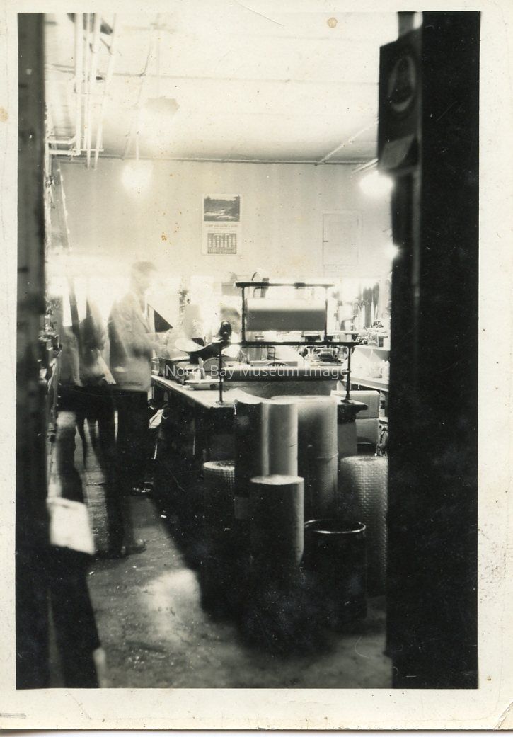 Photograph taken looking towards front of store and customers with rolls of material in foreground. This store was purchaed by John Halliday in 1941. Original owners by J.W. McDonald later joined by Geo E. Hay and firm named “McDonald & Hay”. Eventually Geo. W. McDonald, son of J.W. took over the business and operated until 1941 until sold to John Halliday. Business was later sold to Robert Edwards in 1957. Information from "North Bay" by WKP Kennedy.Date(s) of Creation