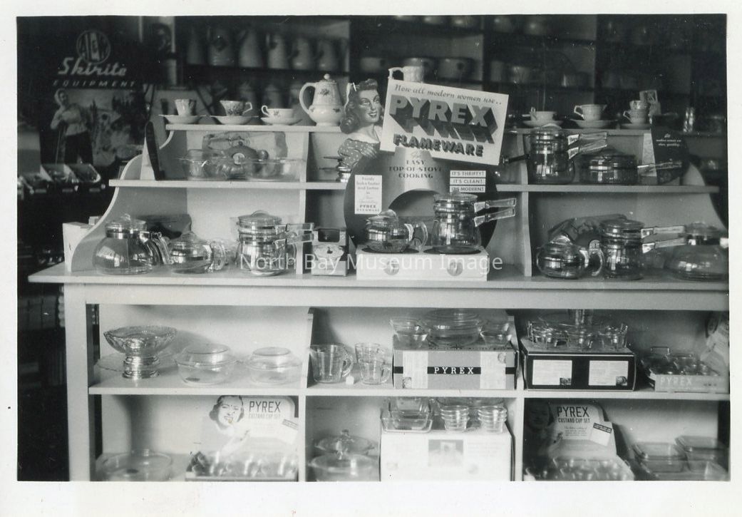 Photo of John Halliday & Son Hardware. This store was purchaed by John Halliday in 1941. Original owners by J.W. McDonald later joined by Geo E. Hay and firm named “McDonald & Hay”. Eventually Geo. W. McDonald, son of J.W. took over the business and operated until 1941 until sold to Joh Halliday. Business was later sold to Robert Edwards in 1957. Information from "North Bay" by WKP Kennedy.