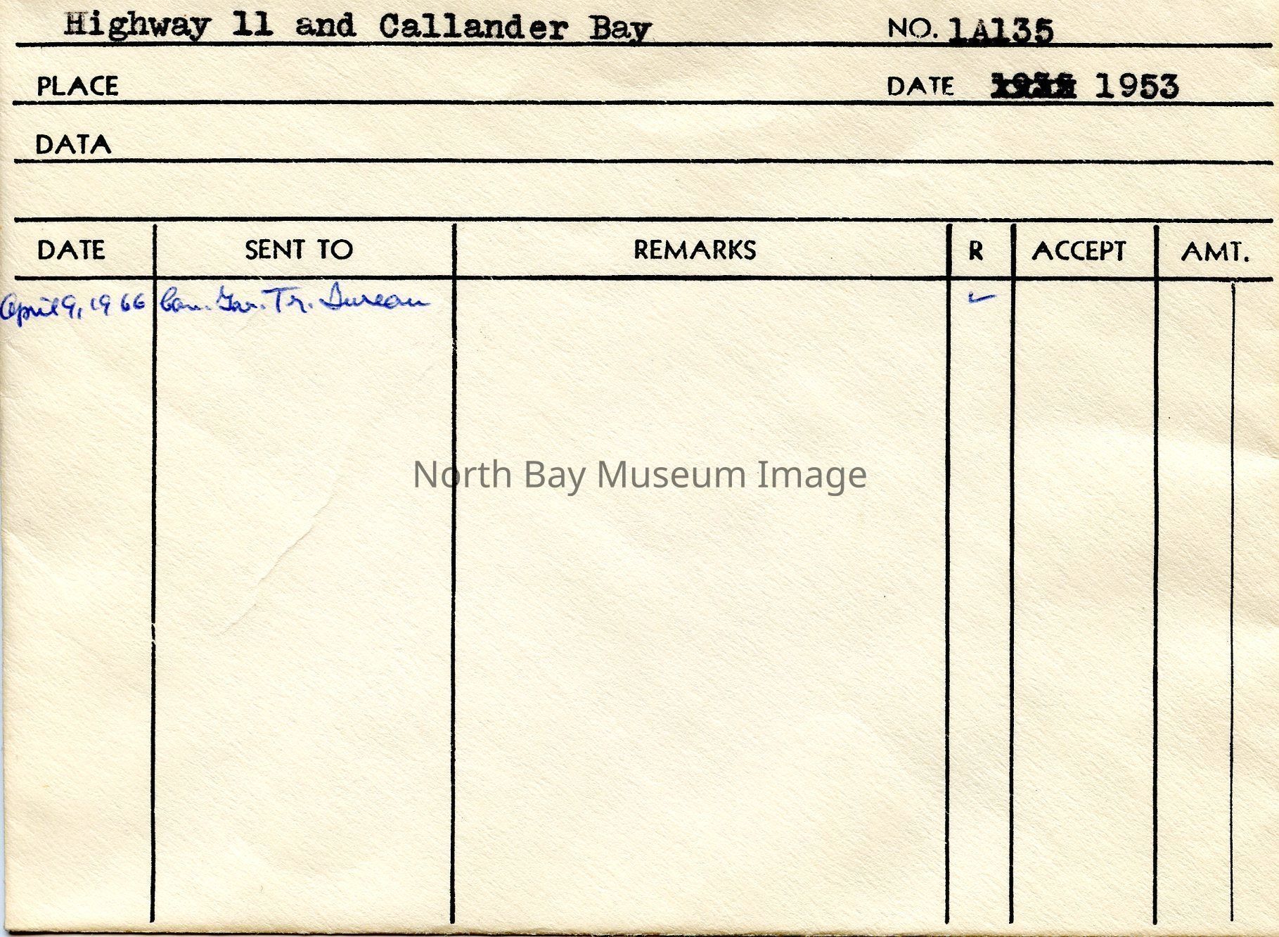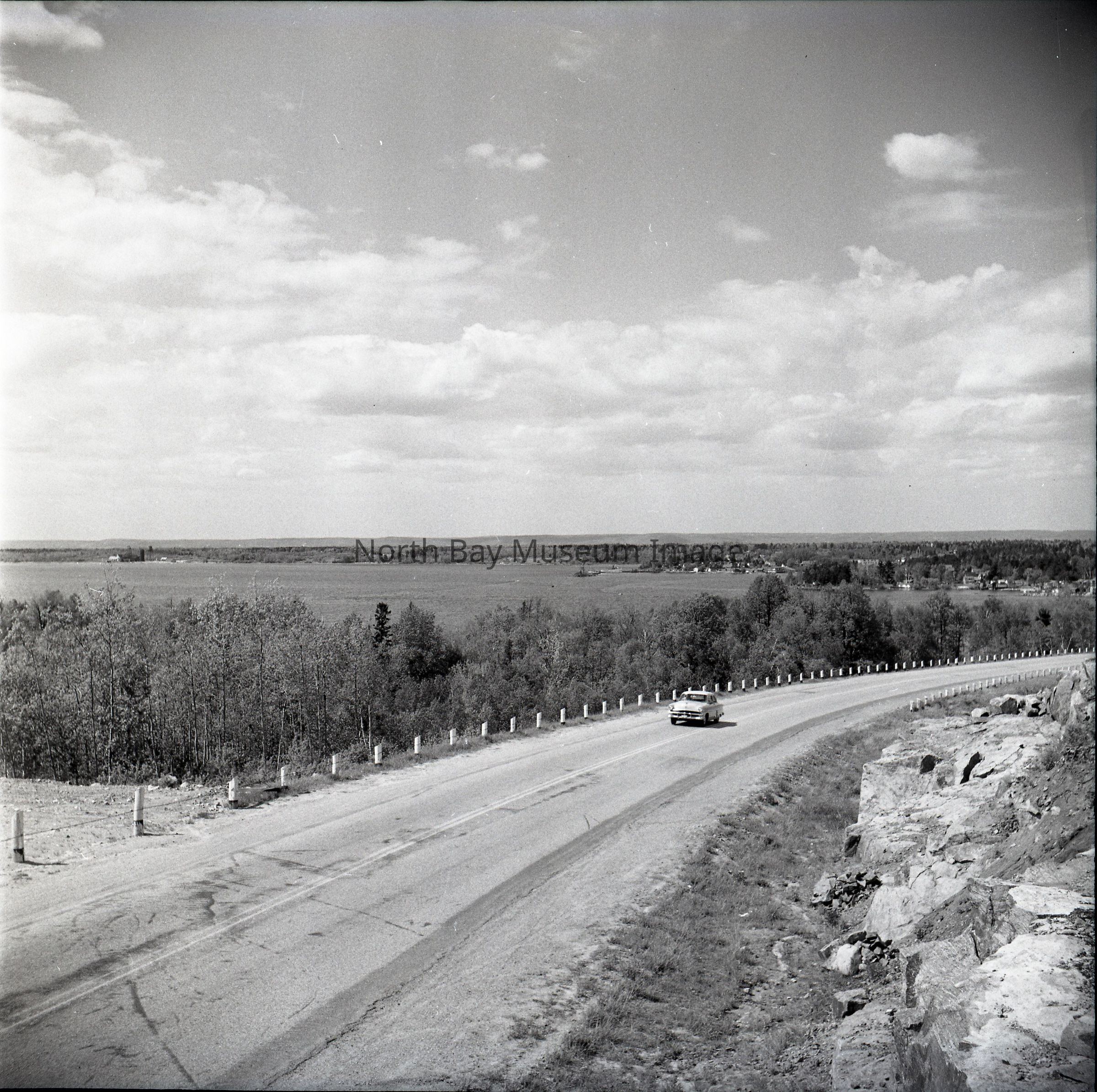 Envelope (a) contains photographs and negatives (b-c) of Highway 11 and Callander Bay. The images shows the Hill into/ comign from Callander as well as the bay itself. the photo focuses on one car on HWY 11. In the background you can see Lake Nipissing. A part of the Forder Collection. The Photographers original acceession number in 1A135. All of the publications are listed on the envelope.Creator