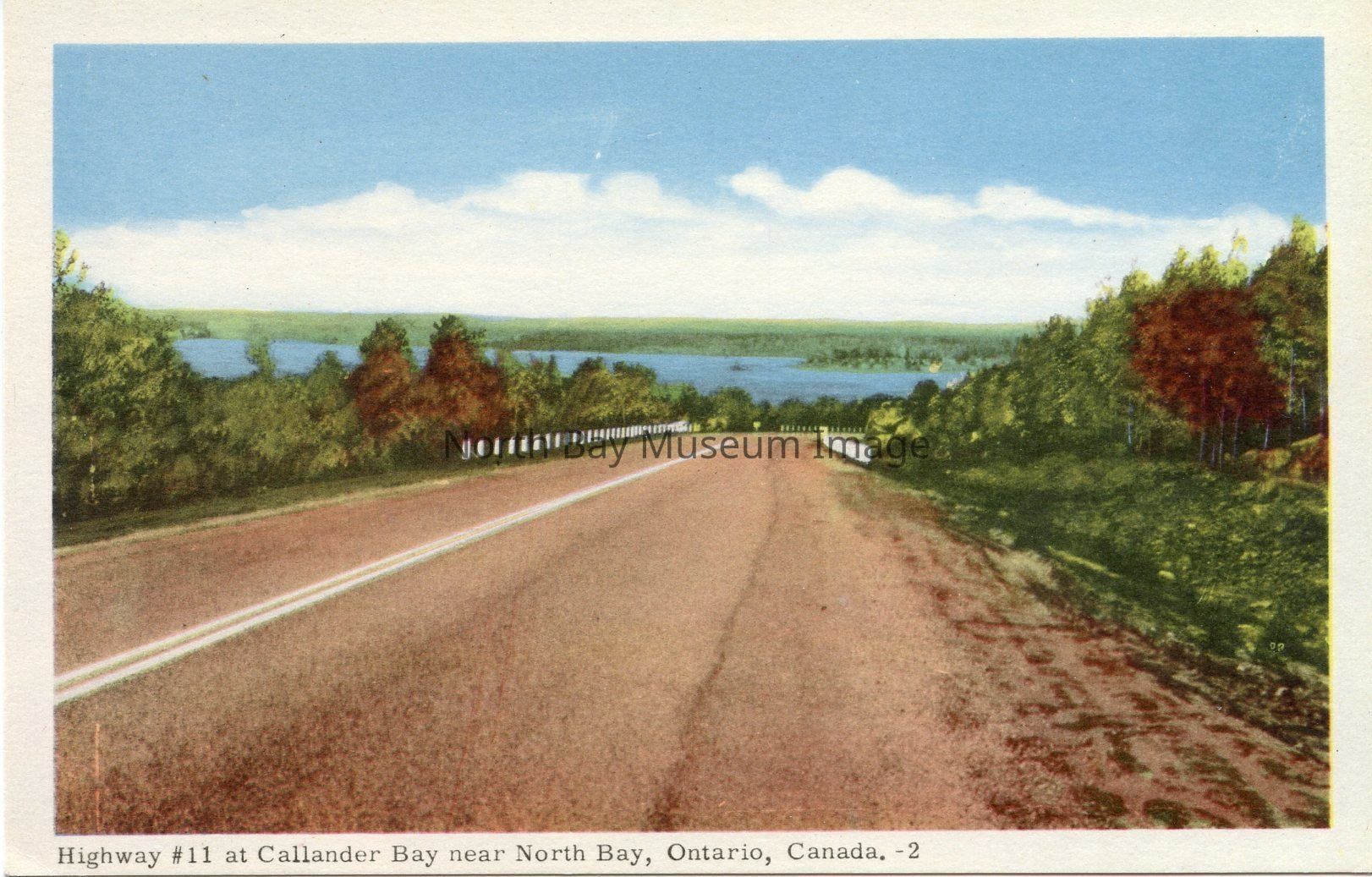 This is a coloured postcard of a winding stretch of Highway 11 at Callander Bay. There appears to be no cars on the highway. The lake can be seen on the far right hand corner of the card. There are various types of trees that line the highway. Some of the trees appear to be red, but most are green. There is a small white fence seperating the highway from the forested area at the side.