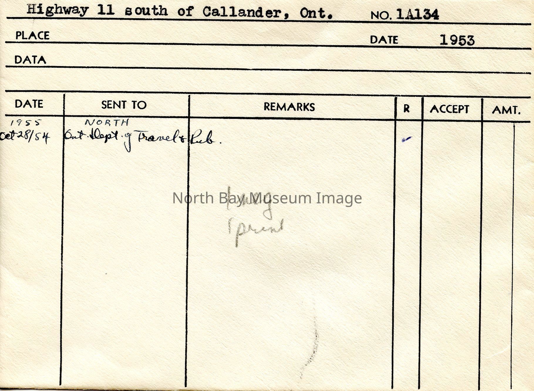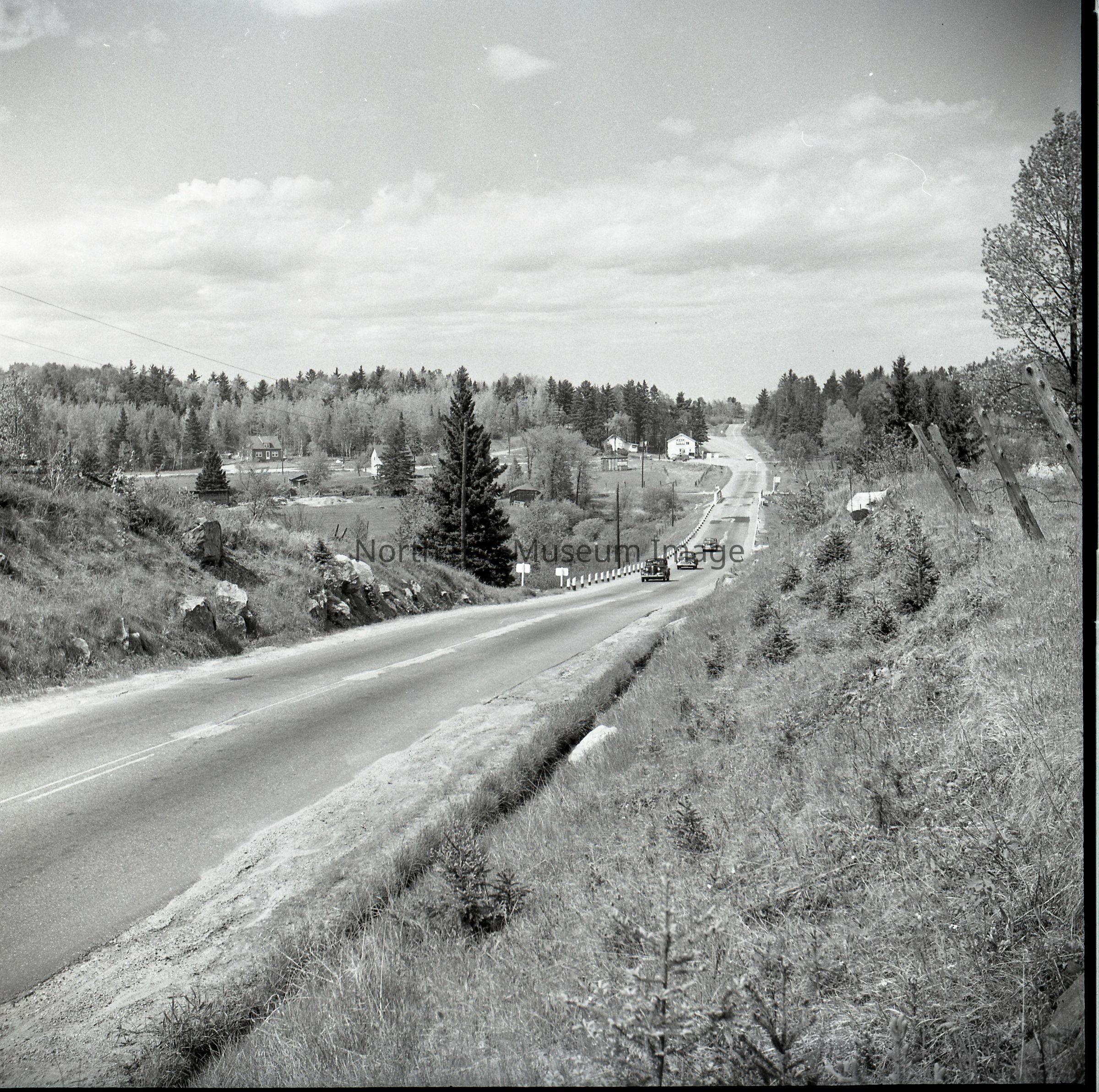 Envelope (a) contains photographs and negatives (b-c) of Highway 11 south of Callander Bay. The images shows cars driving on Highway 11 south of Callander. The picture is taken from the side of the road capturing both the traffic as well as, homes and vegatation that are located on HWY 11. A part of the Forder Collection. The Photographers original number in 1A134. All of the publications are listed on the envelope.Creator